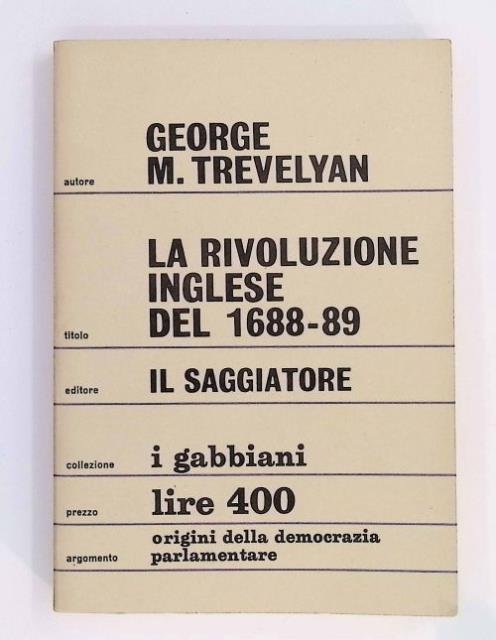 XI, 190 p. ; 22 x 12 cm. I gabbiani, 15. Delle rivoluzioni che colpirono il mondo occidentale, Trevelyan narra qui la meno nota. Essa creò il modello dello Stato parlamentare e borghese. E fu essa stessa il modello della rivoluzione che senza catastrofi vince in modo quasi perfetto: Trevelyan mette in luce le cause e le concause (anche fortuite) di quanto avvenne, ma si serba molto discreto nel cercarvi una conferma della propria ideologia. Lascia così al lettore un largo margine di giudizio su un evento che, nonostante la sua portata dapprima insulare, riguarda la storia e la civiltà di tutti gli uomini. Traduzione dall'inglese di Cesare Pavese. Brossura editoriale, coperta in cartoncino flessibile opaco di colore beige. Codice libreria 9912.