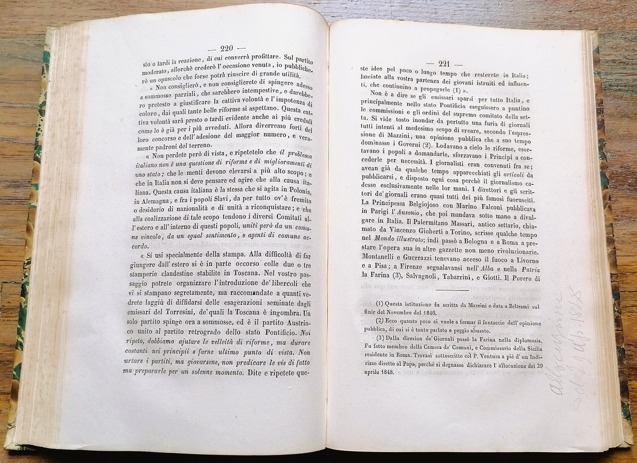 (Repubblica Romana del 1849; Gesuiti) In 8°, legatura coeva in mezza pelle, al dorso titolo e filetti dorati, impressioni a secco, carta marmorizzata ai piatti, pp. 359,(1). Edizione originale con brevi e garbate note a margine vergate a matita su poche pagine. Leggere e sporadiche tracce di ossidazione, peraltro ottimo stato di conservazione.