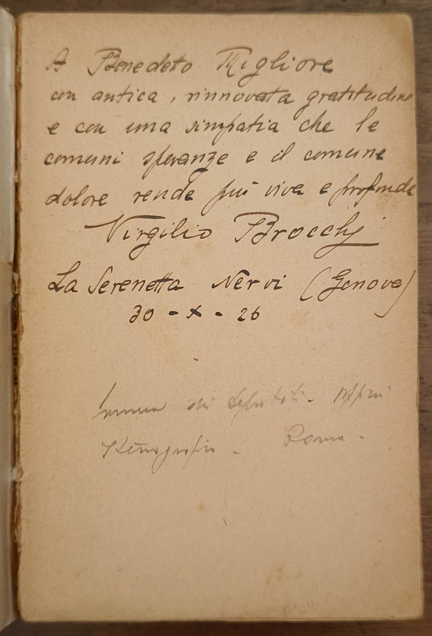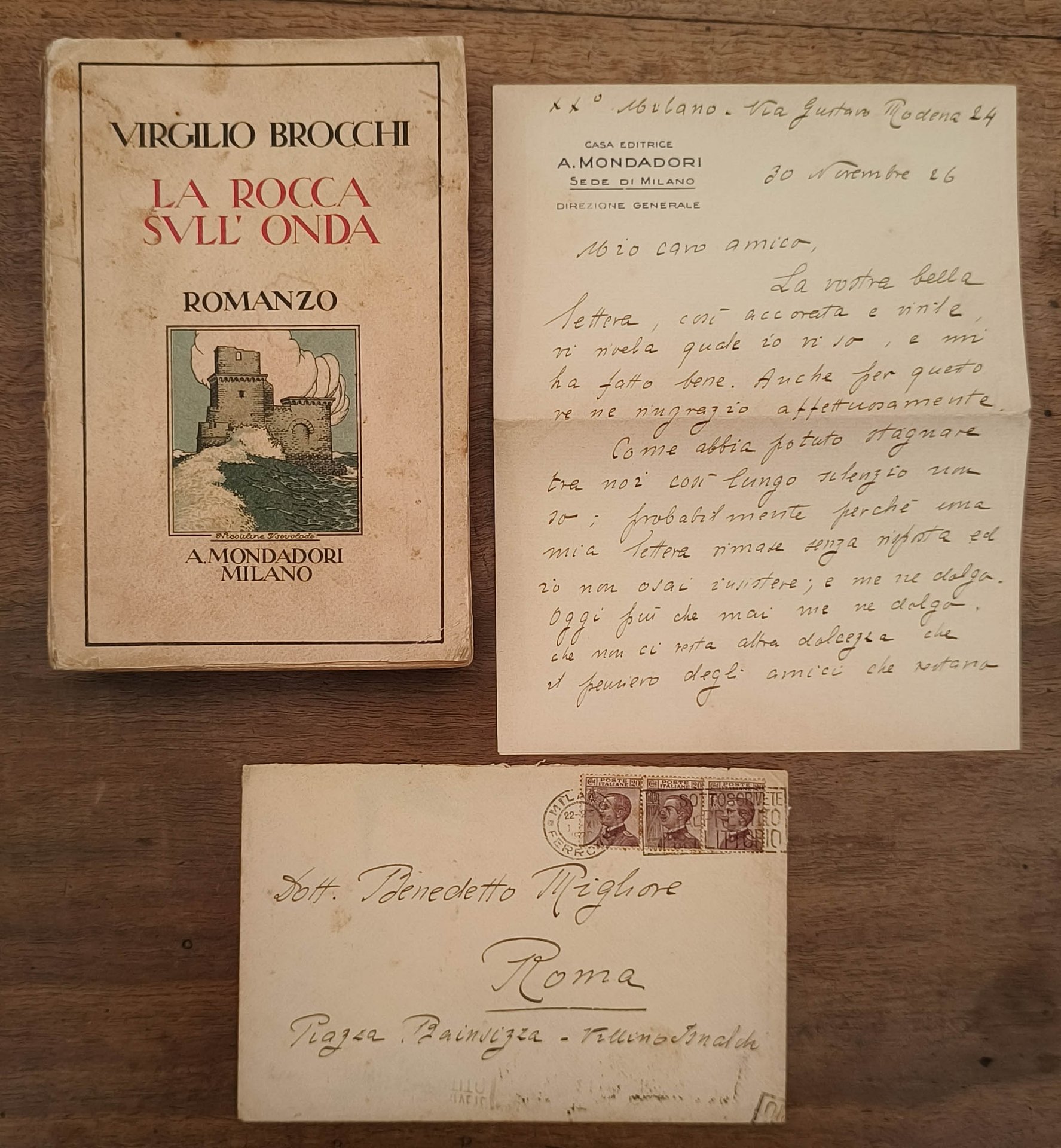 La rocca sull'onda, Milano, Mondadori, 1926. Prima edizione. Cm 18,6. Pp. 404. Brossura editoriale. Legatura con lievi segni d'usura, qualche macchia e strappo. Dedica autografa dell'autore all'antiporta. "A Benedetto Migliore con antica, rinnovata gratitudine e con una simpatia che le comuni speranze e il comune dolore rende più vive e profonde. Virgilio Brocchi La serenetta Nervi (Genova) 30 - X - 26". Si unisce lettera autografa di 2 pp. firmata e datata 30/X/1926, intestata casa editrice Mondadori. Busta affrancata compresa.