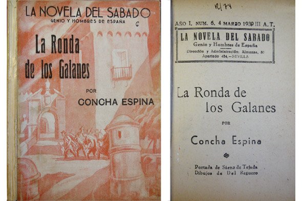 Sevilla, La Novela del Sábado, Marzo 1939. 4to. menor 128 pp., con ilustraciones entre el texto de Del Reguero. Cubiertas originales dibujadas por Sáenz de Tejada.