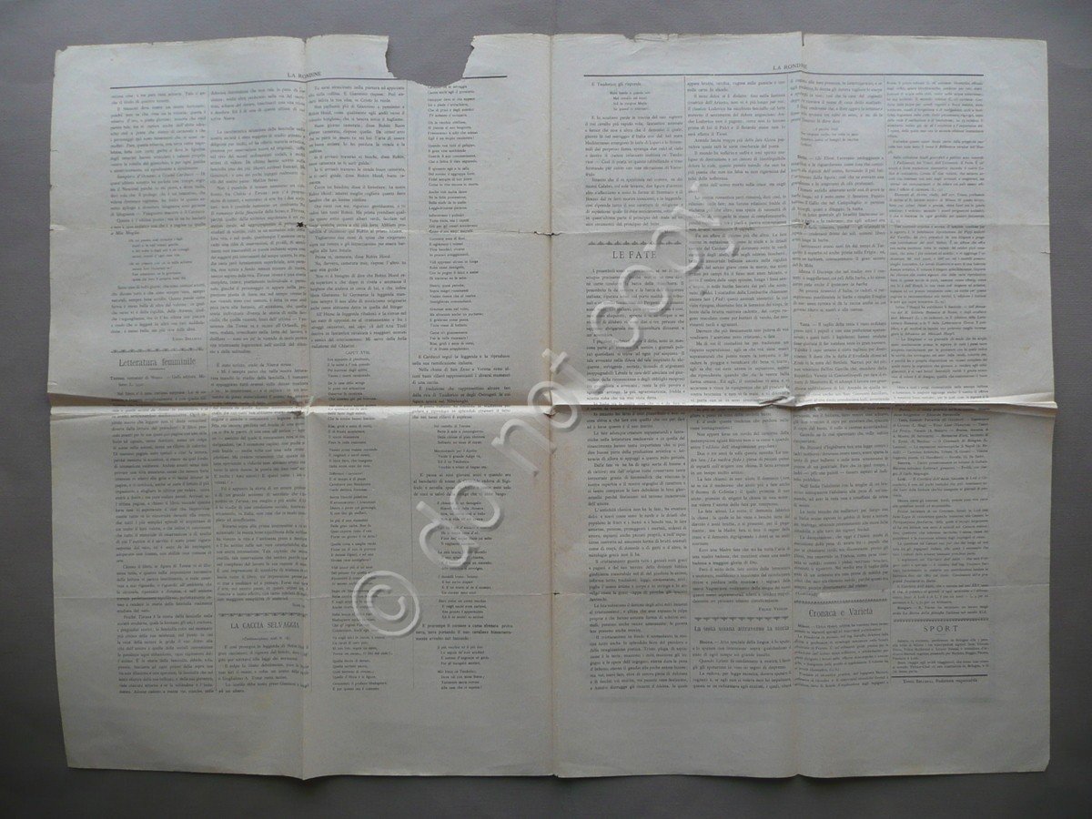 Giornale, La Rondine" Giornale Letterario Artistico Scientifico della Domenica Direttore Emilio Bareggi Anno I - N.20 Bologna - Domenica 15 Agosto 1886 Società Tipografica Azzoguidi, Bologna 1886, cm 58x40, pp. 4 (bifolio), numero completo. Condizioni di conservazione Esemplare complessivamente in buone condizioni con tracce d'uso, pieghe di conservazione, alcune leggerissime bruniture, margini e angoli con alcuni strappetti e pochi minimi difetti, margine sup. delle prime due pagine con circoscritta mancanza che interessa parzialmente qualche carattere ma che non compromette la lettura del testo (vedi foto), un incrocio delle pieghe con piccolissima minima mancanza Alla terza pagina è presente un articolo di Felice Vezzani intitolato "Le Fate", che tratta del ruolo, delle origini e del significato di queste entità fantastiche. SC03.D9116 N "