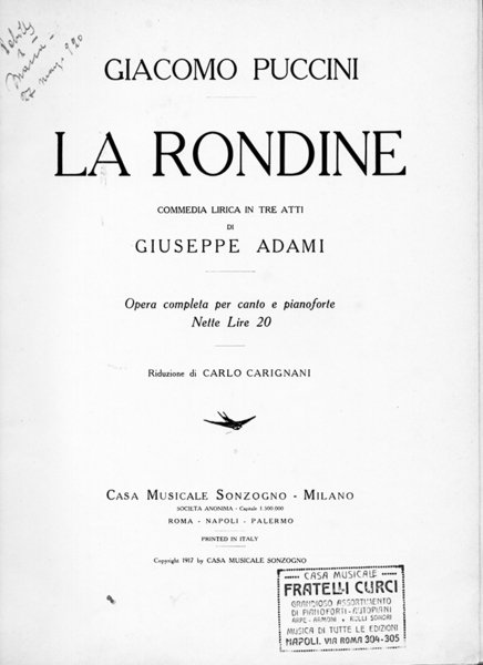 Spartito. Opera completa per canto e pianoforte. Riduzione di Carlo Carignani. P.N. M 2022 S. In antiporta ritratto dell’autore con firma in facsimile.