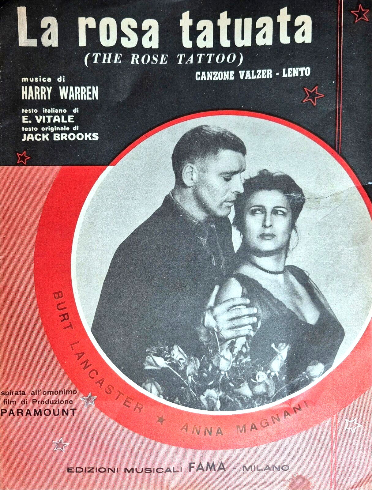 LA ROSA TATUATA spartito della canzone del film omonimo con Burt Lancaster e Anna Magnani. Musica di Harry Warren, testo italiano di E. Vitale, testo originale di Jack Broos.