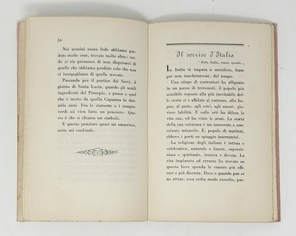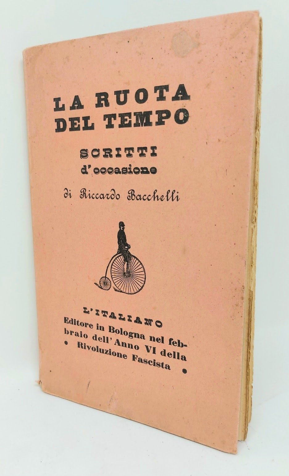 >in-16, pp. 134, (6), ritratto dell'Autore disegnato da Giorgio Morandi in antiporta, brossura editoriale con sovraccoperta incamiciata con vignetta al piatto (attribuibile a Leo Longanesi). Edizione originale e prima opera stampata dall'L'Italiano di Leo Longanesi, che così presenta la sua casa editrice ai lettori: "Iniziando la pubblicazione di questi libri dell'«Italiano», ho cercato di rendere elegante e leggera la parte tipografica onde essa possa intonarsi allo scritto. Non si spaventi il lettore se i caratteri usati sono vari e opposti, bastardi e perfetti, perché solo dalla varietà e dalla bizzarria può rinascere il buon gusto tipografico". Edizione impressa in 500 esemplari numerati (ns. 107), dedicata al Califfo Omar, "il quale dando fuoco alla libreria d'Alessandria si fece protettore naturale dei libri nuovi e insegnò la modestia agli scrittori". Buon esemplare, minimi difetti alla sovraccoperta. Gambetti / Vezzosi, p. 42: "Primo libro pubblicato con questo marchio ed anche per questo piuttosto ricercato". Spaducci, p. 25.