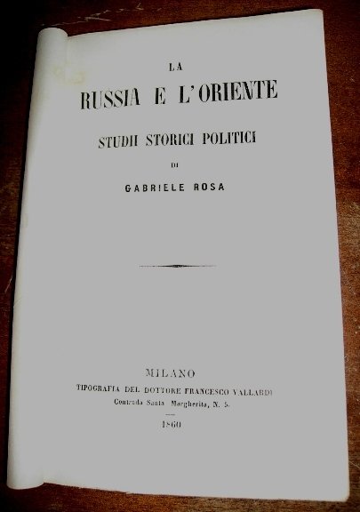 Fascicolo in 12, privo di brossura. Occhiello, frontespizio, prefazione, 56 pp. Interessante saggio storiografico sulla questione d'Oriente, la guerra di Crimea, le ambizioni ed i pensieri segreti della Russia, spiccano nei forti richiami dell'autore. Rara placchetta, in perfetto stato.