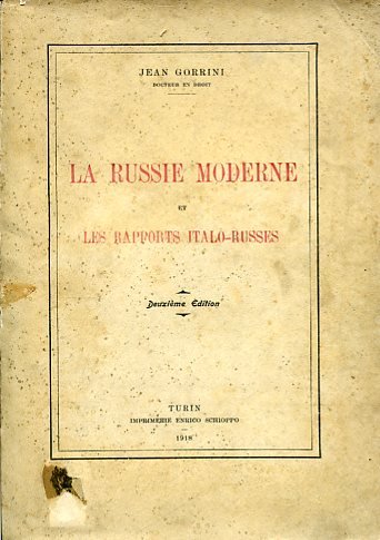 In-8°, pp. XVI, 418, (2), brossura editoriale con titolo in rosso e nero entro duplice filettatura. Al foglio del titolo, dedica autografa dell'autore: 'A S. E. il Sig. Conte Carlo Petitti di Roreto modesto omaggio dell'autore. Torino, 10 gennaio 1919 G. Gorrini'. Tabelle statistiche n.t. Tra le pp. 272-273, una tav. in b.n. relativa alla ditta di cappelli Borsalino e al suo fatturato nell'anno 1913, per complessivi due milioni di cappelli venduti nel mondo. In barbe ed intonso, in ottimo stato salvo minime ingialliture dovute al tipo di carta. Il volume, uscito originariamente nel pieno della Prima Guerra Mondiale, reca numerose cancellature della censura da p. 280 a p. 325, relative a brani contenenti dati su stabilimenti industriali utili alla guerra. Leditore ne promette una riedizione non censurata alla fine delle ostilità ('Cette oeuvre, qui a vu le jour en pleine guerre modiale, a été censurée dans quelques partie ayant trait aux établissements industriels auxiliaires. Les coupures qui y ont été faites. demeureront comme un souvenir de l'époque tragique que nous traversons; elles ajouteront même à l'importance du livre et lui donneront un intérêt tout particulier. L'ouvrage paraîtra dans son texte intégral dès que les hostilités auront cessé'). Seconda edizione di questo importante studio sulla Russia moderna e i rapporti diplomatici italo-russi; questa seconda edizione (la prefazione reca la data del 15 novembre1917, a Rivoluzione d'Ottobre avvenuta) ribadisce la speranza in un futuro accordo italo-russo. Capitoli sulla topografia, il clima, la demografia, le religioni, l'amministrazione statale, la vita sociale, l'economia, l'industria e l'agricoltura, la caccia, la pesca e la zootecnia, i prodotti minerari, le vie di comunicazione terrestri e marittime, la partecipazione russa alla Prima Guerra Mondiale. La seconda parte, sulle relazioni italo-russe, contiene un capitolo sulla Russia all'Esposizione di Torino del 1911. Il Gorrini fu giurista e console italiano a Trebisonda (proprio nell'esercizio del suo ruolo diplomatico egli assistette al genocidio degli armeni in Turchia, da lui denunciato in alcune corrispondenze) e studioso di questioni geopolitiche, segnatamente in relazione alla slavistica. Bibliografia Nazionale - 1918, 1455.