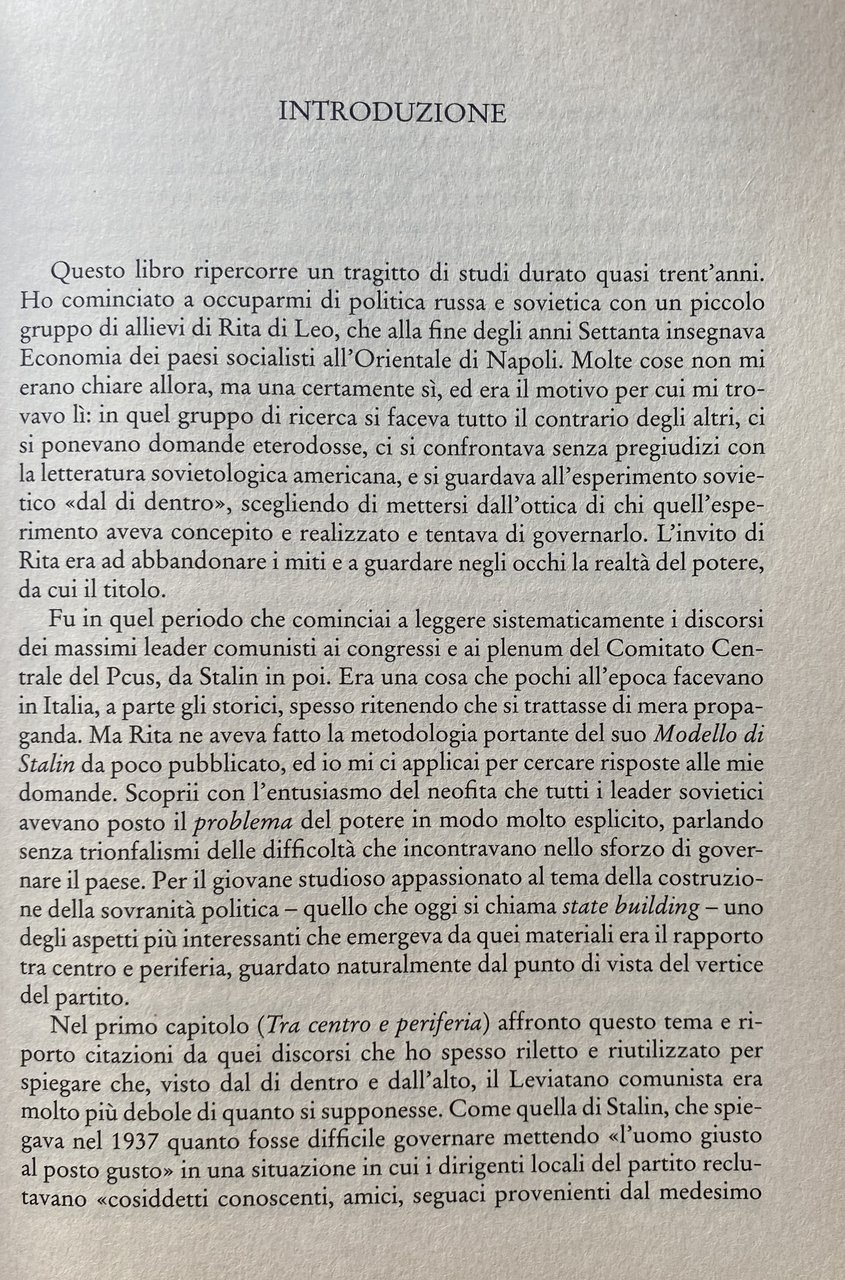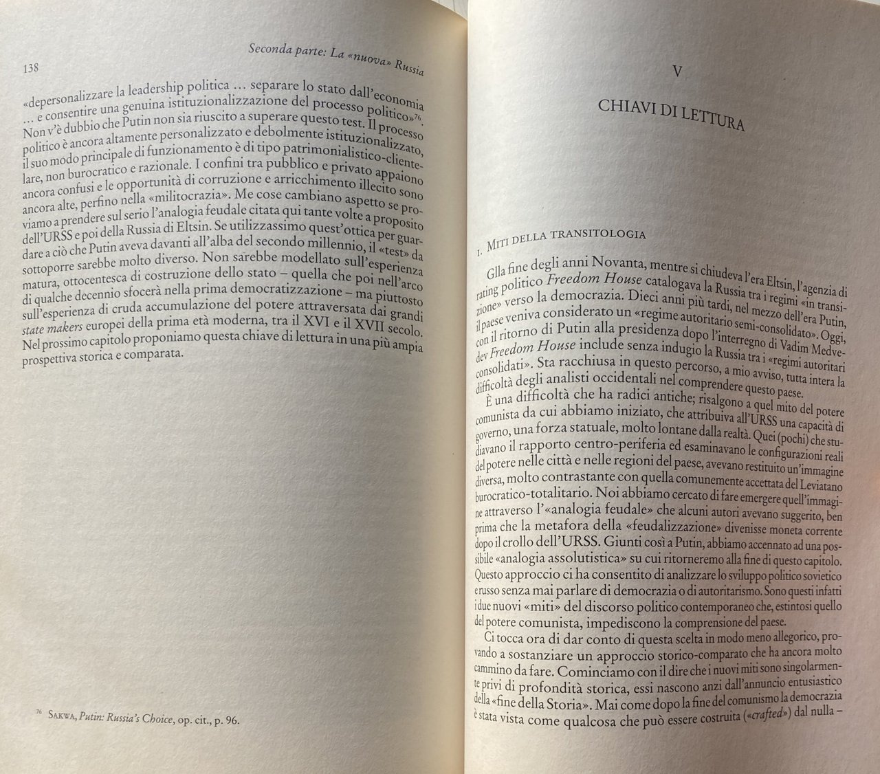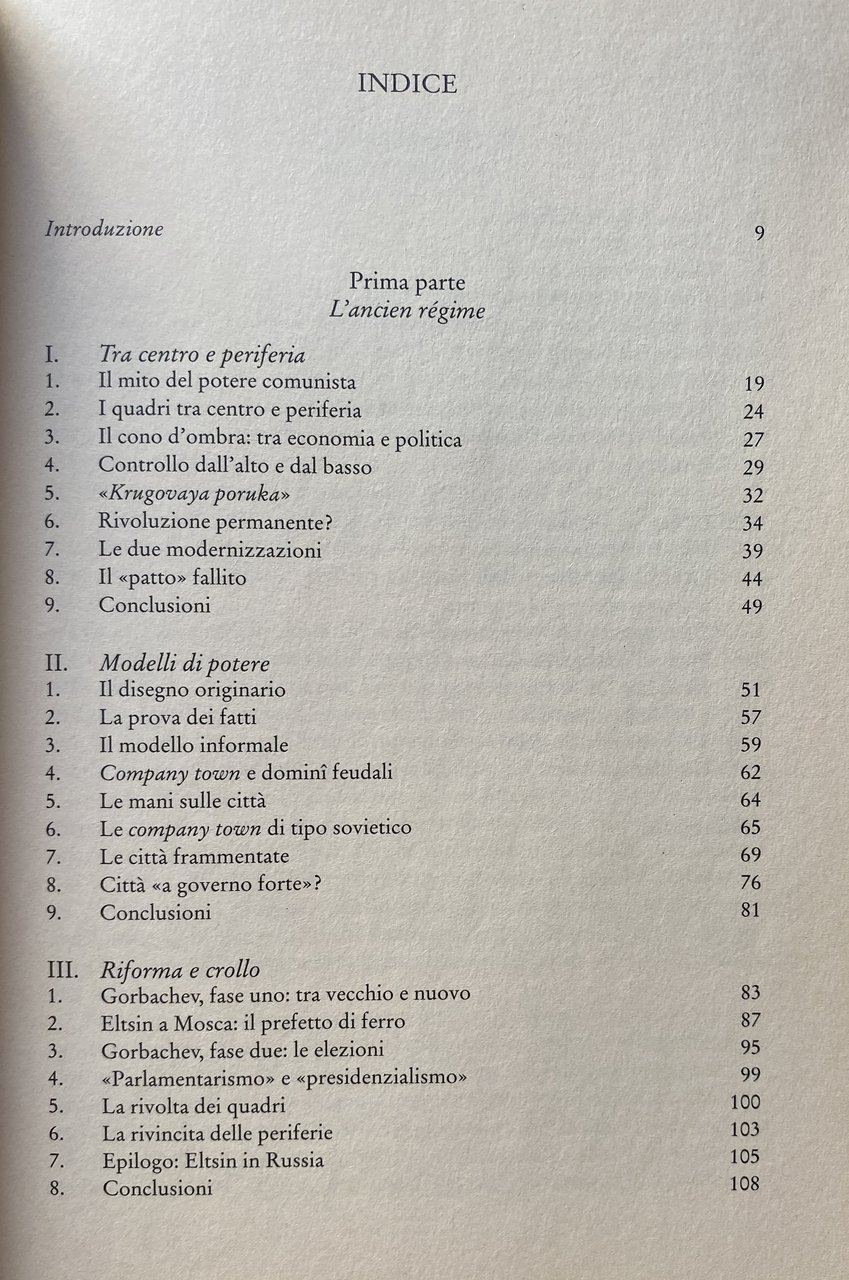 INDICE Introduzione Prima parte L'ancien régime I. Tra centro e periferia 1. Il mito del potere comunista 2. I quadri tra centro e periferia 3. Il cono d'ombra: tra economia e politica 4. Controllo dall alto e dal basso 5. «Krugovaya poruka» 6. Rivoluzione permanente? 7. Le due modernizzazioni 8. Il «patto» fallito 9. Conclusioni II. Modelli di potere 1. Il disegno originario 2. La prova dei fatti 3. Il modello informale 4. Company town e dominî feudali 5. Le mani sulle città 6. Le company town di tipo sovietico 7. Le città frammentate 8. Città «a governo forte»? 9. Conclusioni III. Riforma e crollo 1. Gorbachev, fase uno: tra vecchio e nuovo 2. Eltsin a Mosca: il prefetto di ferro 3. Gorbachev, fase due: le elezioni 4. «Parlamentarismo» e «presidenzialismo» 5. La rivolta dei quadri 6. La rivincita delle periferie 7. Epilogo: Eltsin in Russia 8. Conclusioni Seconda parte La «nuova» Russia IV. Stato, baroni e oligarchi 1. Eltsin e i suoi baroni 2. Oligarchi vecchi e nuovi 3. Configurazioni di potere locale 3.1 Regioni «controllate dallo stato»? 3.2 Regioni «corporate» 3.3 Regioni «pluraliste» 3.4 Élite politiche contro elite economiche 4. Putin e la lotta alla feudalizzazione 5. Conclusioni V. Chiavi di lettura 1. Miti della transitologia 2. La centralità del tema dello stato 3. Mappe storiche: una proposta 4. L'analogia feudale e la Russia di Eltsin 5. Putin e l'analogia assolutistica 5.1 Politica ed economia 5.2 Centro e periferia 5.3 Stato e reti clientelari 6. Conclusioni Bibliografia.