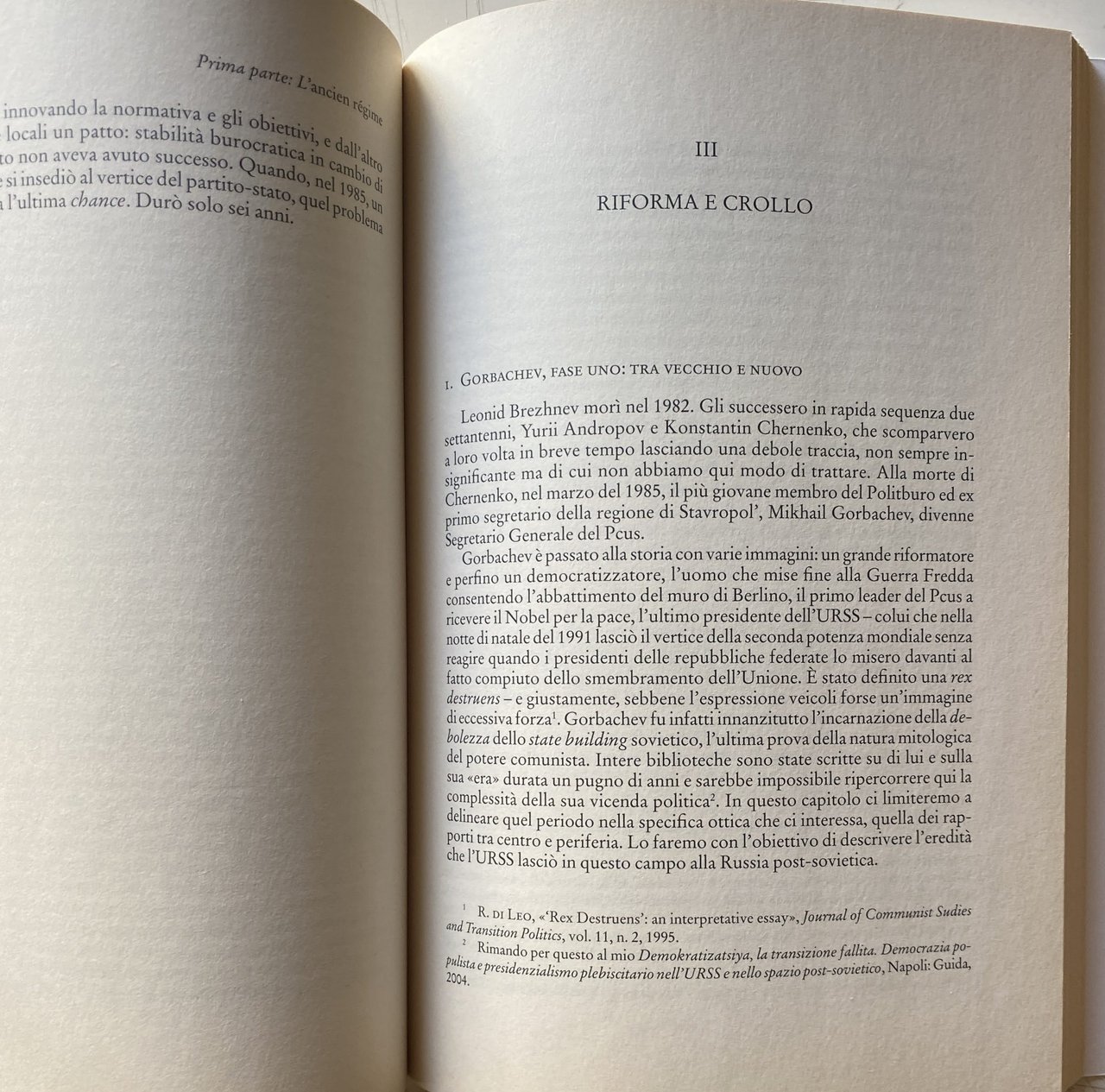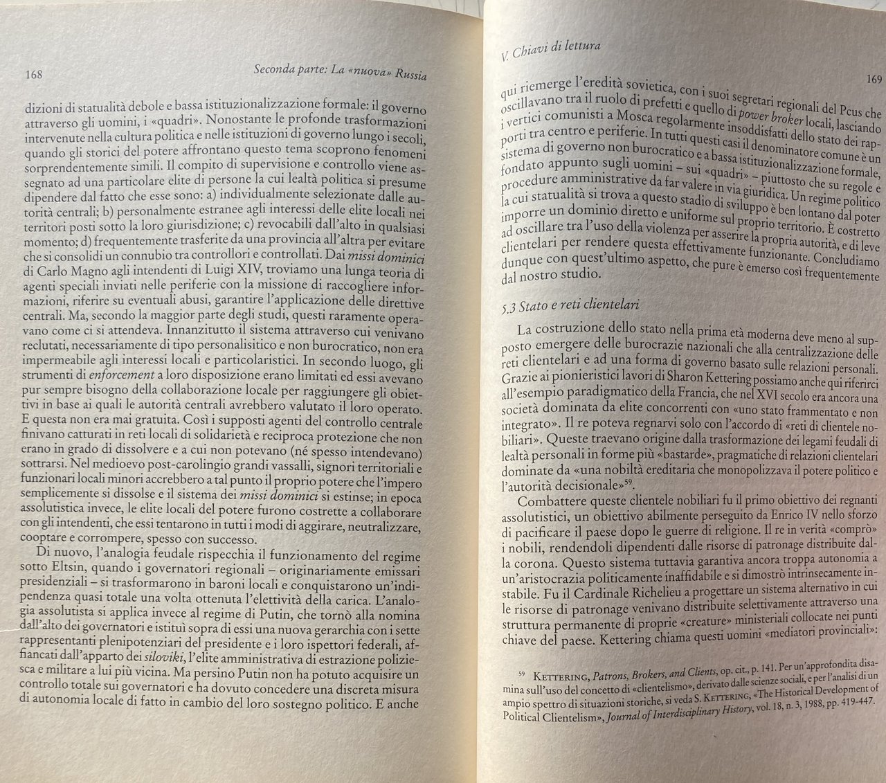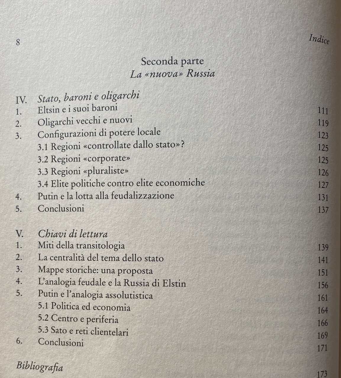 Soggetti: Storia contemporanea, Geopolitica, Russia, Politica, Forme politiche, Stato, Impero Imperialismo, Guerre, Unione Sovietica, Crollo, Comunismo, Ideologie, Ancien régime Centro Periferia Burocrazia Centralizzazione Pianificazione economica Capitalismo Mitologia Miti Potere Partito comunista Quadri Krugovaya poruka Rivoluzione permanente Modernizzazione Modelli Company town Feudalesimo Oligarchia Città frammentate Governo forte Riforma Perestroika Glasnost Gorbachev Eltsin Mosca Elezioni Parlamentarismo Presidenzialismo Rivolta Periferie Baroni Oligarchi Regioni Controllo Élite economiche Putin Feudalizzazione Transitologia Ucraina Repubbliche sovietiche Stati Uniti Mappe storiche Assolutismo Reti clientelari Dissoluzione Corruzione Saggi Libri fuori catalogo Riferimento Studi culturali Mentalità Europa Germania Diplomazia Bibliografia Demokratizatsiya La transizione fallita Kremlino Unita Interessi Patronage Risorse pubbliche Lobbying Integrazione Stabilità Pcus Populismo Plebiscito Censura Cina Nucleare Spazio Leadership Stalin Protezione Nomenklatura Sovetskoe Stroitel'stvo Malenkov Robert Dahl Elitismo Floyd Hunter Robert Orrtung Ricchezza Vladimir Shlapentokh Gosudarstvennost Nicholas Henshall Autocrazia Dispotismo Huntington Brzezinski Totalitarismo Morton San Pietroburgo Anna Politkovskaya Gas Petrolio Oblast Frammentazione Costituzione Funzionari Amministrazione Bashkortostan Bielorussia Cecenia PCRF Difesa Deputati Duma Elezioni Legge federale Etnica Consiglio Federazione Politica estera Gorbaciov Izvestiya Kazakistan Khasbulatov LDPR Militari Ministri Nazionalisti NATO Nezavisimaya Perestrojka Popolazione Postcomunista Privatizzazione Referendum Regime Repubbliche RFE/RL Rossiiskaya Gazeta Sovranità Soviet Supremo Borghesia Tatarstan Territorio Vladimir Yabloko Burlatskij Robert Conquest Giulietto Chiesa Cattel Di Leo Fukuyama Hoffmann Hellmann Gustafson Gehlen Graeme Gill Katz Kahn Rigby Rees Richard Sakwa Stiglitz Tatu Charles Tilly Zlotnik Sahlapentokh Autonomia Indipendenza Andropov Chernenko Cremlino Contemporary history Geopolitics Politics Political forms State Empire Imperialism Wars Soviet Union Collapse Communism Ideologies Center Periphery Bureaucracy Centralization Economic planning Capitalism Mythology Myths Power Communist Party Cadres Permanent revolution Modernization Models Feudalism Oligarchy Fragmented cities Strong government Reform Moscow Elections Parliamentarism Presidentialism Revolt Suburbs Barons Oligarchs Regions Control Feudalization Transitology Ukraine Soviet republics United States Historical maps Absolutism Client networks Dissolution Corruption Essays Out of print books Reference Cultural studies Mentality Europe Germany Diplomacy Bibliography Interests Public resources Integration Stability Populism Plebiscite Censorship China Nuclear Space Protection Wealth Autocracy Despotism Totalitarianism St. Petersburg Oil Fragmentation Constitution Officials Administration Belarus Chechnya Defense Deputies Elections Federal law Ethnicity Council Federation Foreign policy Military Ministers Nationalists Population Postcommunist Privatization Republics