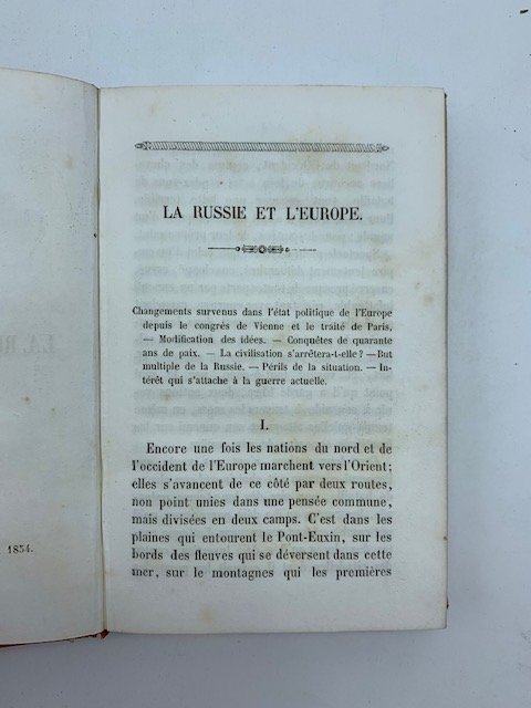 In 24 (cm 9,5 x 14,5), pp. (4) + 250. Cartonatura editoriale di colore rosso con la scritta oro al piatto anteriore "Dono per l'anno 1855". Saggio anonimo, pubblicato dall'editore torinese Chirio e Mina, che specifica nell'introduzione di aver pubblicato l'opera per rispondere alle esigenze di quanti volevano essere aggiornati sulle vicende d'Oriente. Il saggio cerca di chiarire le cause delle guerre intraprese da Francia e Inghilterra che minano l'Europa e paralizzano le sue industrie e commerci.