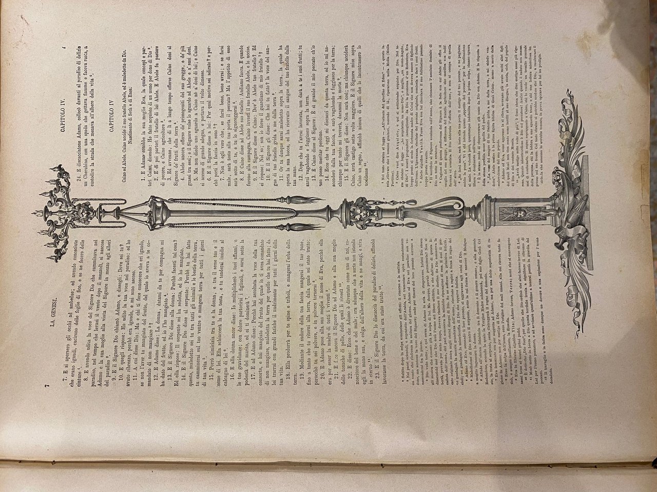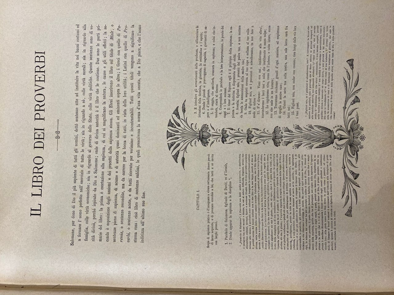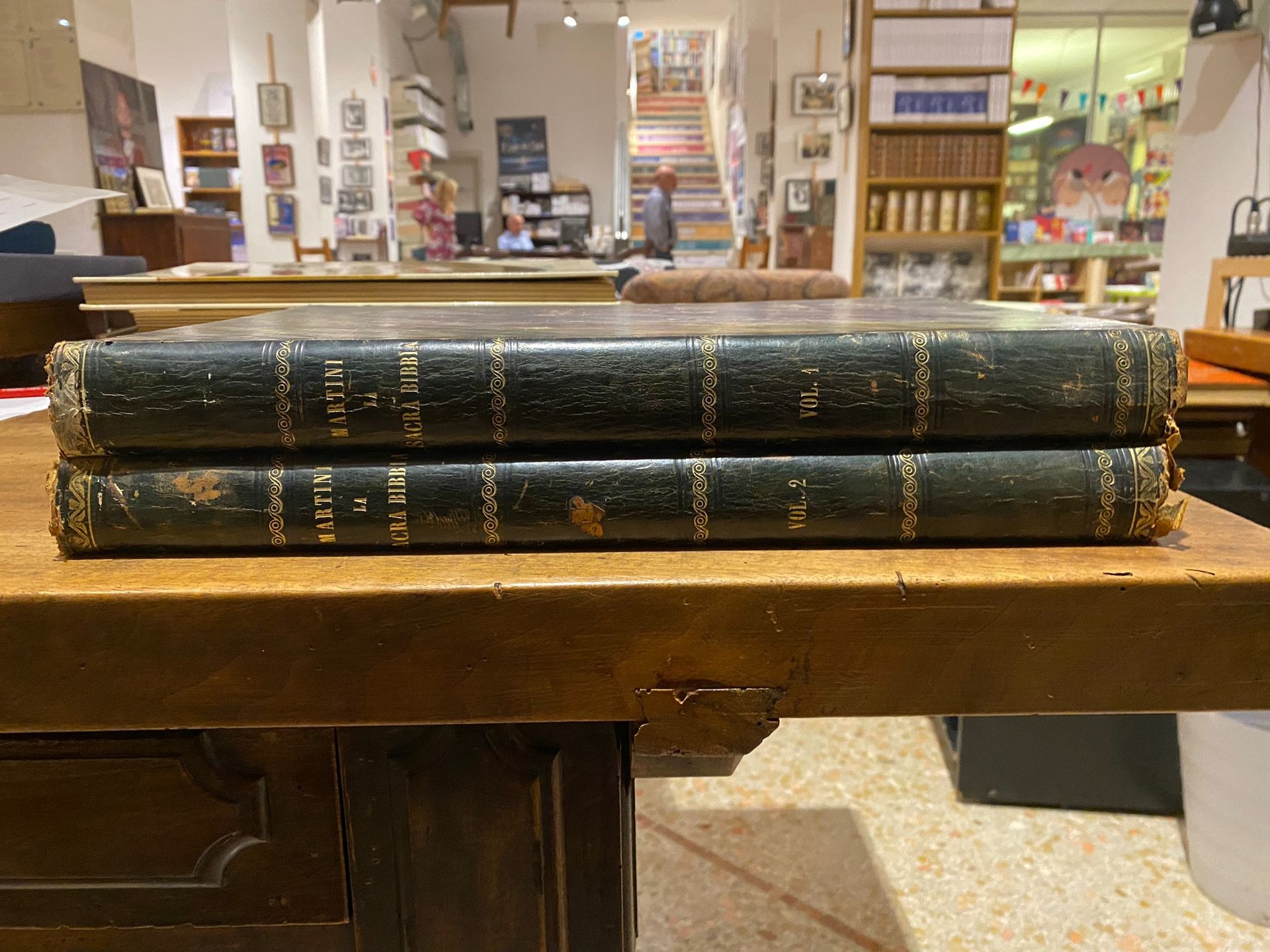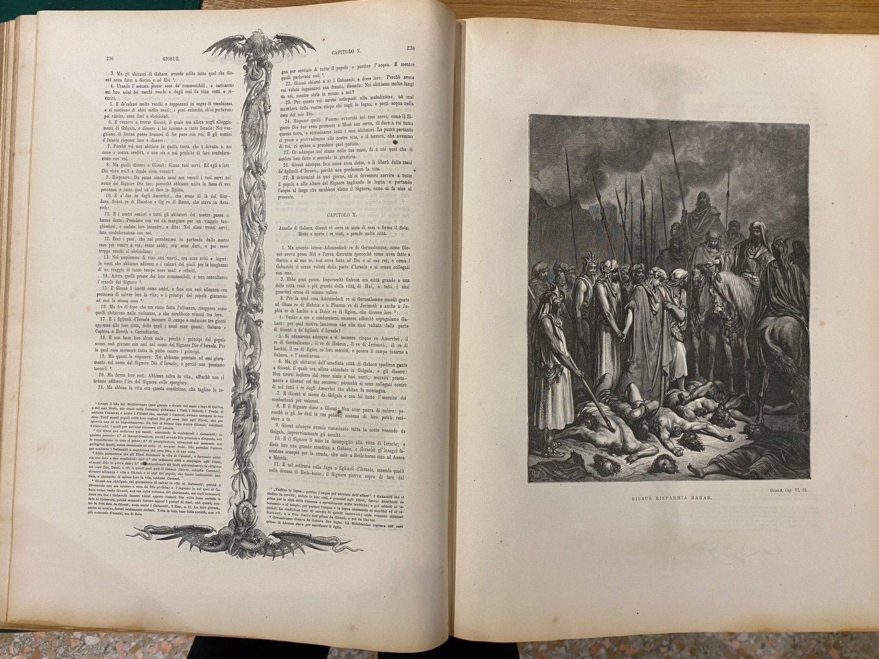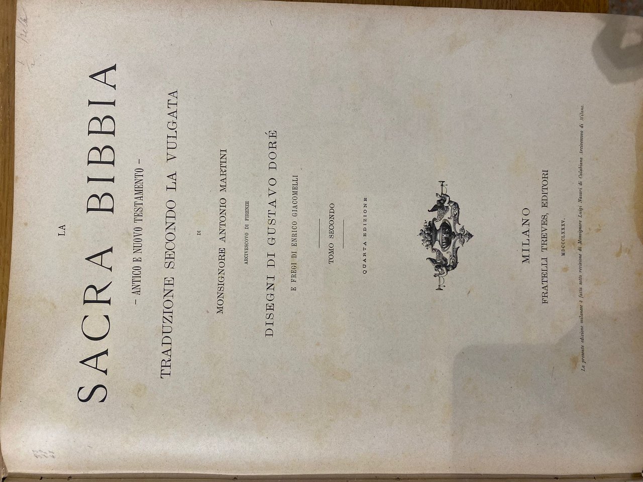 Coppia di volumi che comprende l'Antico ed il Nuovo Testamento. Traduzione secondo vulgata di Monsignore Antonio Martini e disegni di Gustavo Dorè con fregi di Giacomelli. Presenta 230 belle tavole (120 per il Vecchio e 110 per il Nuovo Testamento) a illustrazione di alcuni episodi biblici ed articolate rappresentazioni di fregi nella parte del testo. Tracce di usura agli angoli e alle cerniere, dorso rilassato, normale ingiallimento della carta e foxing diffuso.