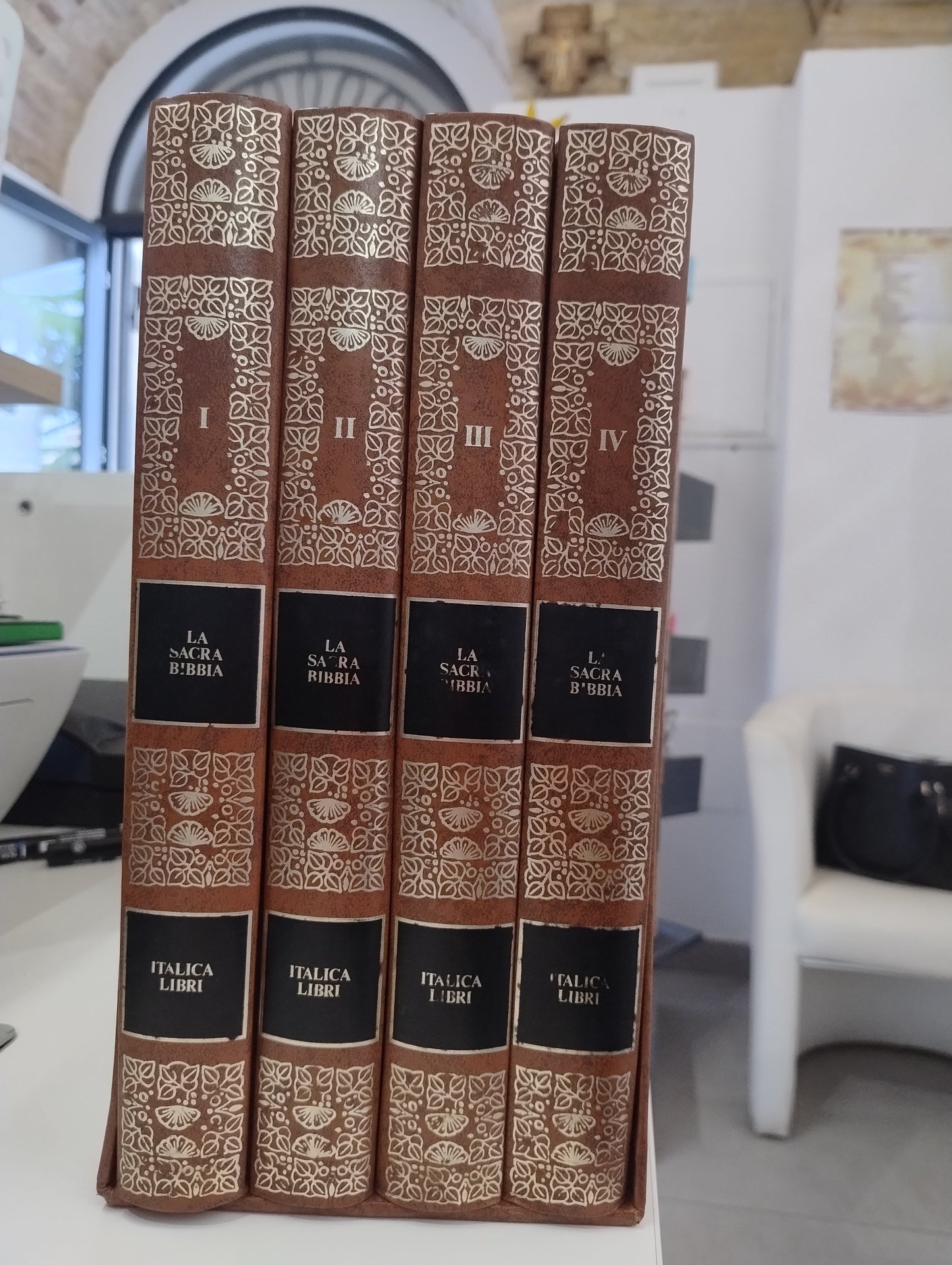 Opera completa - 23x33, quattro volumi con cofanetto, tutti rilegati in simil pelle con accenti dorati. pp. 1258 su quattro volumi. Inclusiva di antico testamento, lettere, e apocalisse. Impreziosita da frequenti illustrazioni e dettagli di Gustave Dorè. Ottime condizioni, senza visibili segni di usura oltre una leggerissima imbrunitura sul dorso superiore.