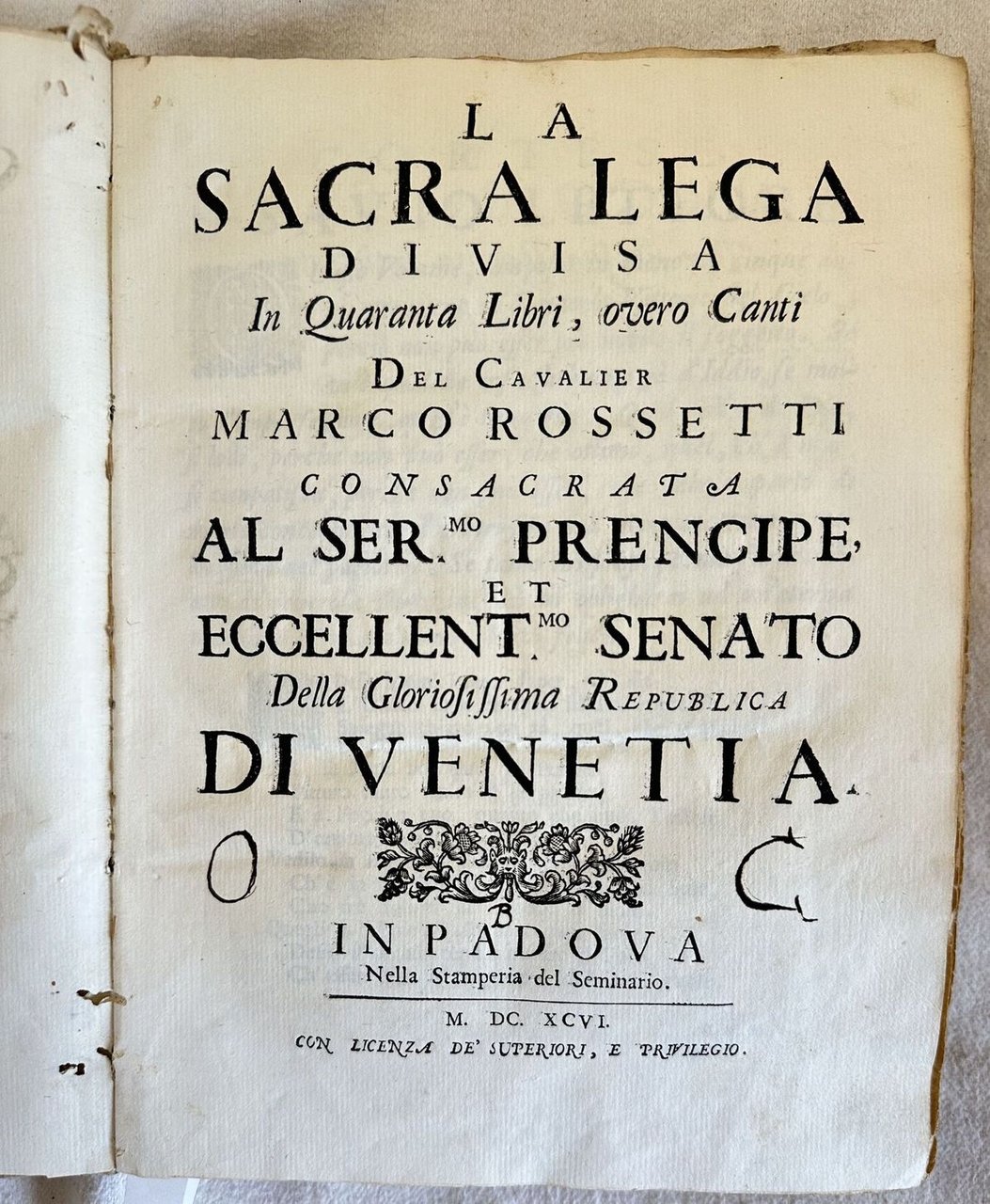 LA SACRA LEGA DIVISA IN QUARANTA LIBRI, OVERO CANTI DEL CAVALIER MARCO ROSSETTI CONSACRATA AL SER.MO PRENCIPE ET ECCELLENT.MO SENATO DELLA GLORIOSISSIMA REPUBLICA DI VENETIA