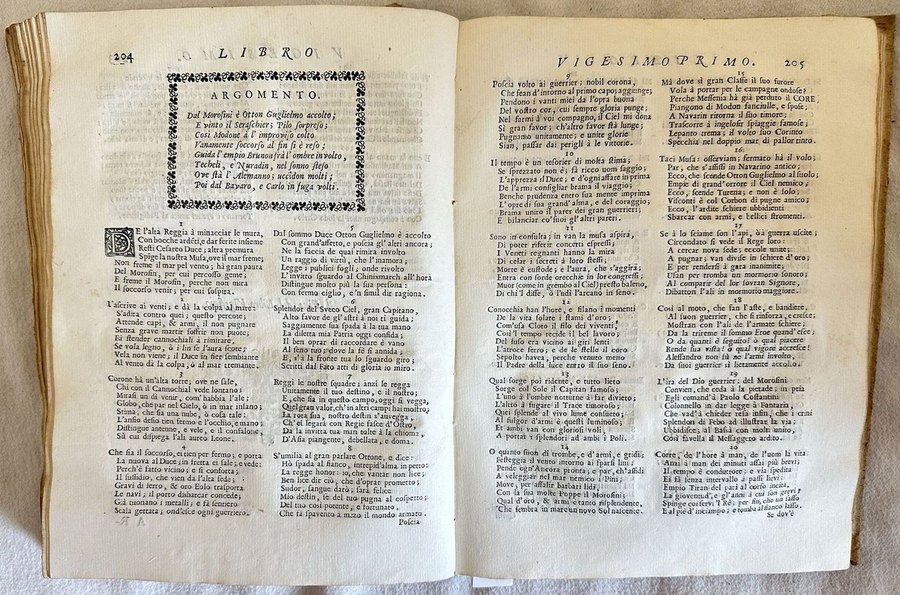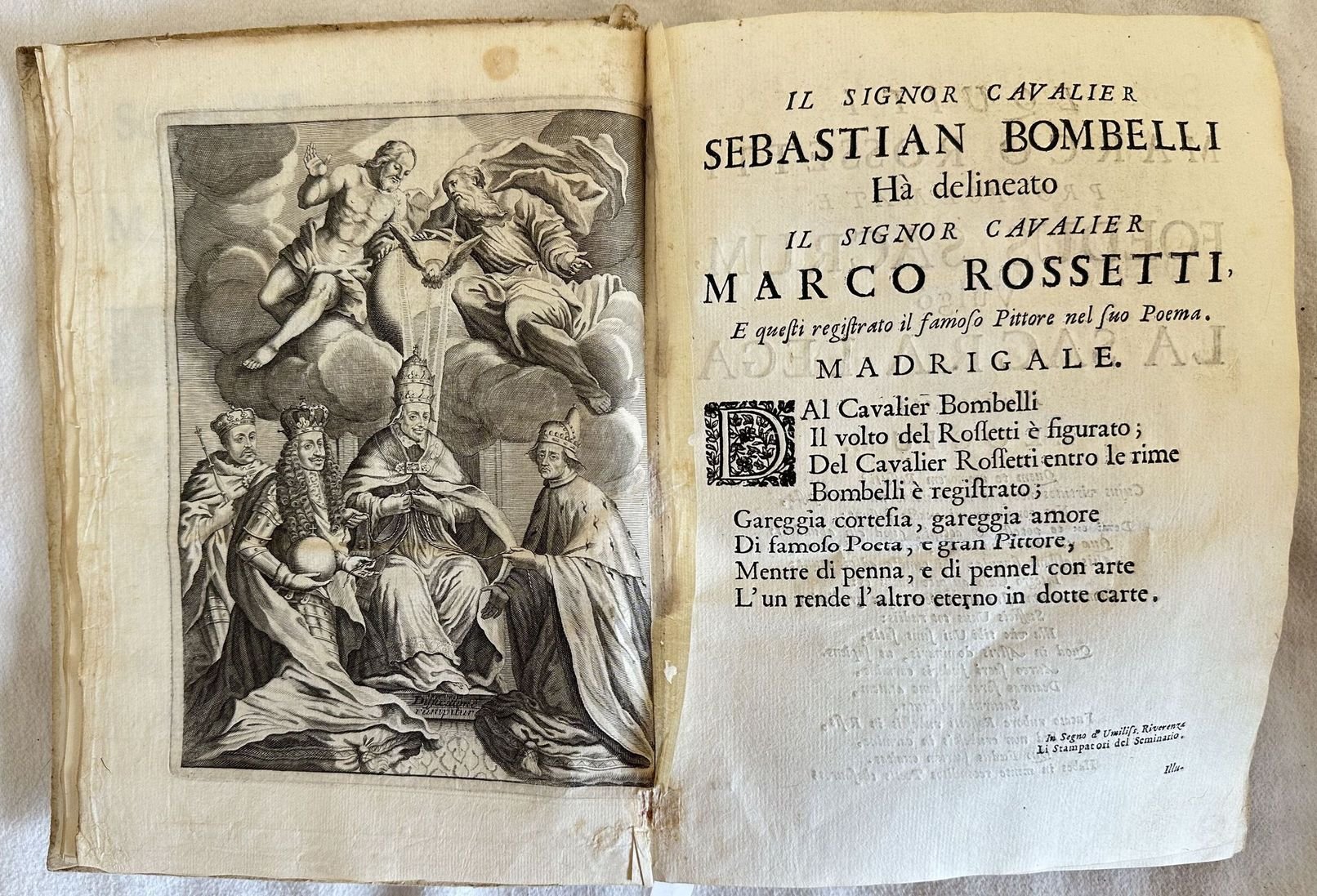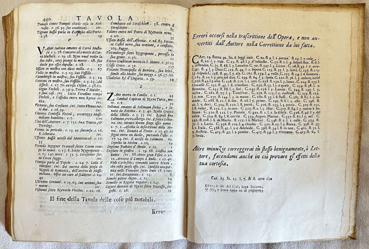 Prima edizione del 1696 di questo poema scritto da Marco Rossetti (sec. 17).<BR><BR>"Soggetto del poema è un grande avvenimento contemporaneo, la guerra combattuta dall'Austria contro il Turco, guerra di cui l'episodio più noto ? fu la difesa di Venezia sostenuta da Carlo di Lorena e da Giovanni Sobieski. Nel suo poema, ch'è dedicato alla Repubblica di Venezia, il Rossetti ebbe cura di far risaltare la parte notevolissima che in quella guerra ebbero i Veneziani ?". Cicogna, 1954.<BR><BR>Ritratto dell'autore e antiporta figurata.<BR><BR>Ode a Marco Rossetti per il suo poema a cura di Lorenzo Sabionara, Giacomo Bolzanini, Sebastian Bombelli ecc.<BR><BR>In buone condizioni e completo.<BR><BR>Copertina cartonata con titolo manoscritto al dorso in buone condizioni con lievi usure marginali. Legatura in discrete condizioni con rotture. Pagine in ottime condizioni generali con rare fioriture. Segni di tarlo al margine di piegatura delle prime quattro carte. In 8. Dim. 23,5x15,5 cm. Pp. (22)+440+(1). Peso Kg. 0,670.First edition of 1696 of this poem written by Marco Rossetti (sec. 17).<BR><BR>"Soggetto del poema è un grande avvenimento contemporaneo, la guerra combattuta dall'Austria contro il Turco, guerra di cui l'episodio più noto ? fu la difesa di Venezia sostenuta da Carlo di Lorena e da Giovanni Sobieski. Nel suo poema, ch'è dedicato alla Repubblica di Venezia, il Rossetti ebbe cura di far risaltare la parte notevolissima che in quella guerra ebbero i Veneziani ?". Cicogna, 1954.<BR><BR>Portrait of the author and figurated frontspice.<BR><BR>Ode to Marco Rossetti for his poem to Lorenzo Sabionara, Giacomo Bolzanini, Sebastian Bombelli ecc.<BR><BR>In good conditions and complete. <BR><BR> <BR><BR>Carton cover with handwritten title in the spine in good conditions lightly worn in the extremities. Binding in fair conditions with cracks. Pages in very good conditions with occasional foxing. Worming in the folding edge of the first 4 pages. In 8. Dim. 23,5x15,5 cm. Pp. (22)+440+(1). Peso Kg. 0,670.
