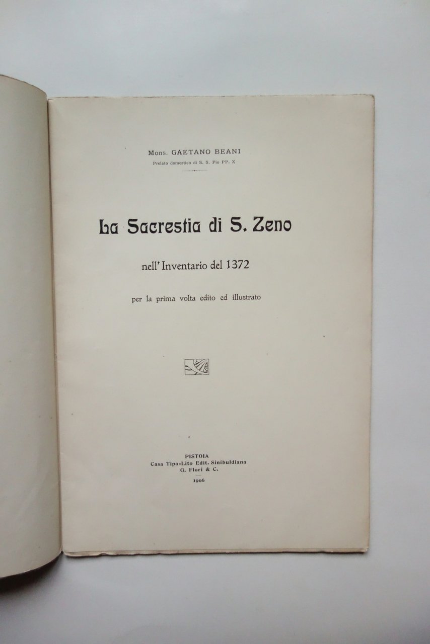 Mons. Gaetano Beani, La Sacrestia di S. Zeno nell'inventario del 1372 per la prima volta edito ed illustrato Tipo-Lit. Sinibuldiana, Pistoia 1906; cm 24,5x17; pp. 28-[2]; brossura ed. Condizioni di conservazione Buone condizioni con leggere tracce d'uso, ancora parzialmente intonso; angolo superiore della brossura posteriore con una piccola pieghetta. OPEB.5610 N