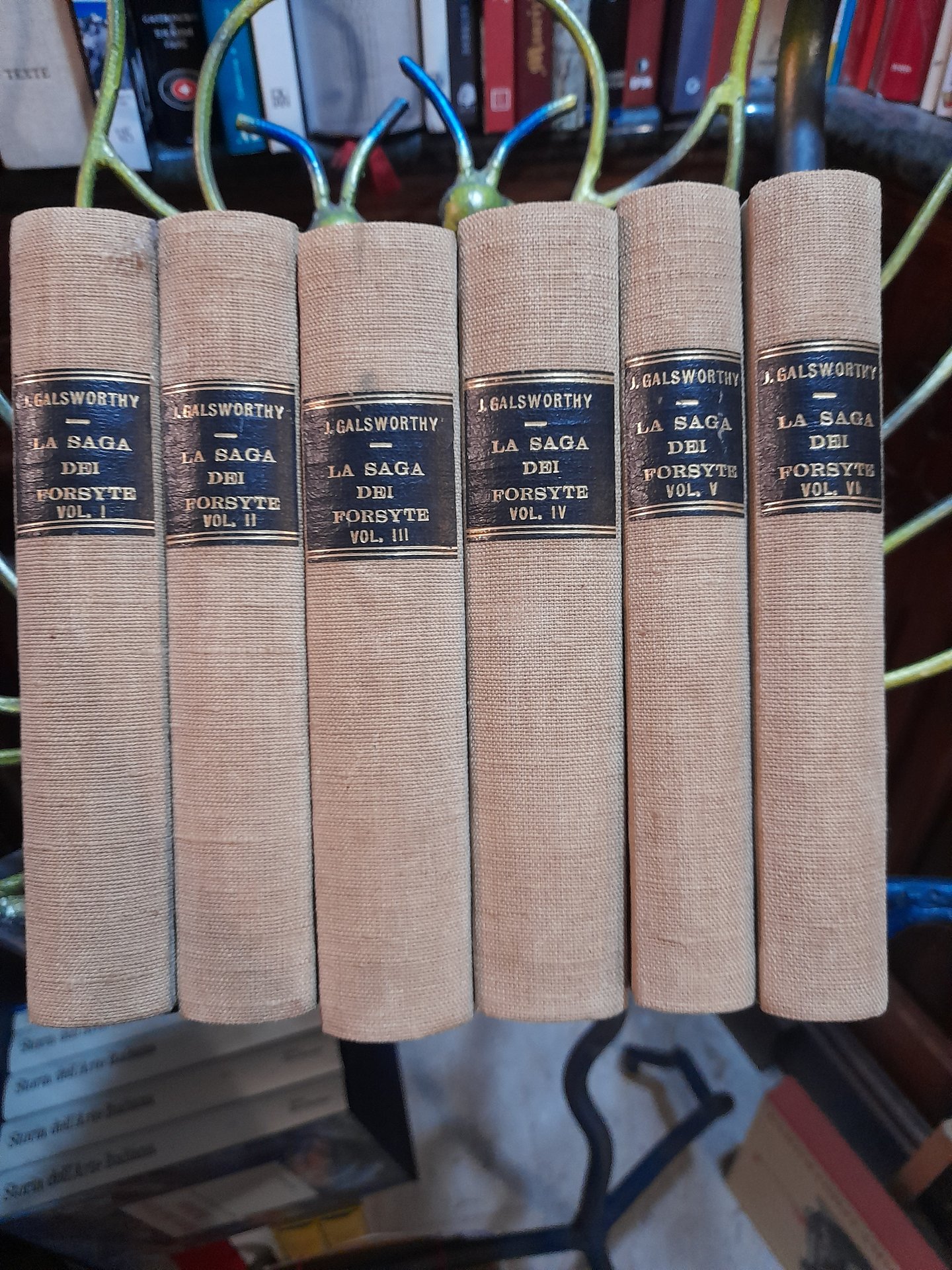 Sei volumi. Cm. 13X20, (I) il possidente pp. 452, (II) in tribunale pp. 430, (III) da affittare pp. 470, (IV) scimmia bianca pp. 456, (V) cucchiaio d’argento pp. 359, (VI) canto del cigno pp. 379; legati in piena tela di sacco con titoli in oro al dorso su tassello in pelle. Ottima conservazione. Raro.