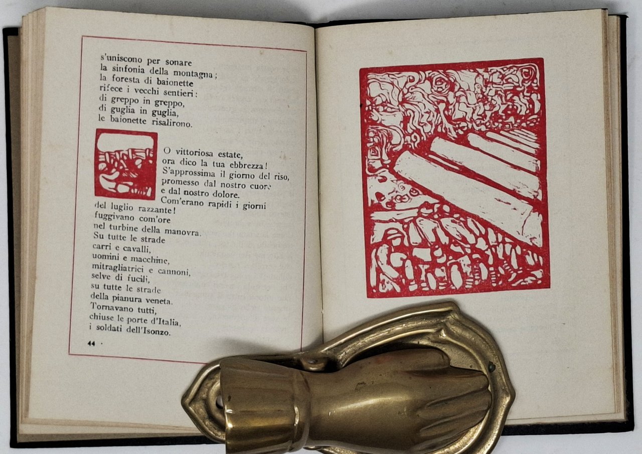Serie: i gioielli dell'eroica (2). Finito di imprimere il 16 ottobre 1921 nella Tipografia dei Fratelli Magnani di Milano. Con numerose graziose xilografie in rosso di Francesco Gamba. Pagine: 71 + [1]. Formato: 12 x 16,5 cm circa. Rilegatura non editoriale cartonata rigida. Stato di conservazione: un'ampia dedica (non dell'autore) datata 1927 sul primo foglio bianco, qualche piccola macchiolina gialla ma, nel complesso, un buon esemplare. Al fondo del volume è presente il catalogo editoriale de 'L'Eroica' (da pagina 65 a pagina 72).