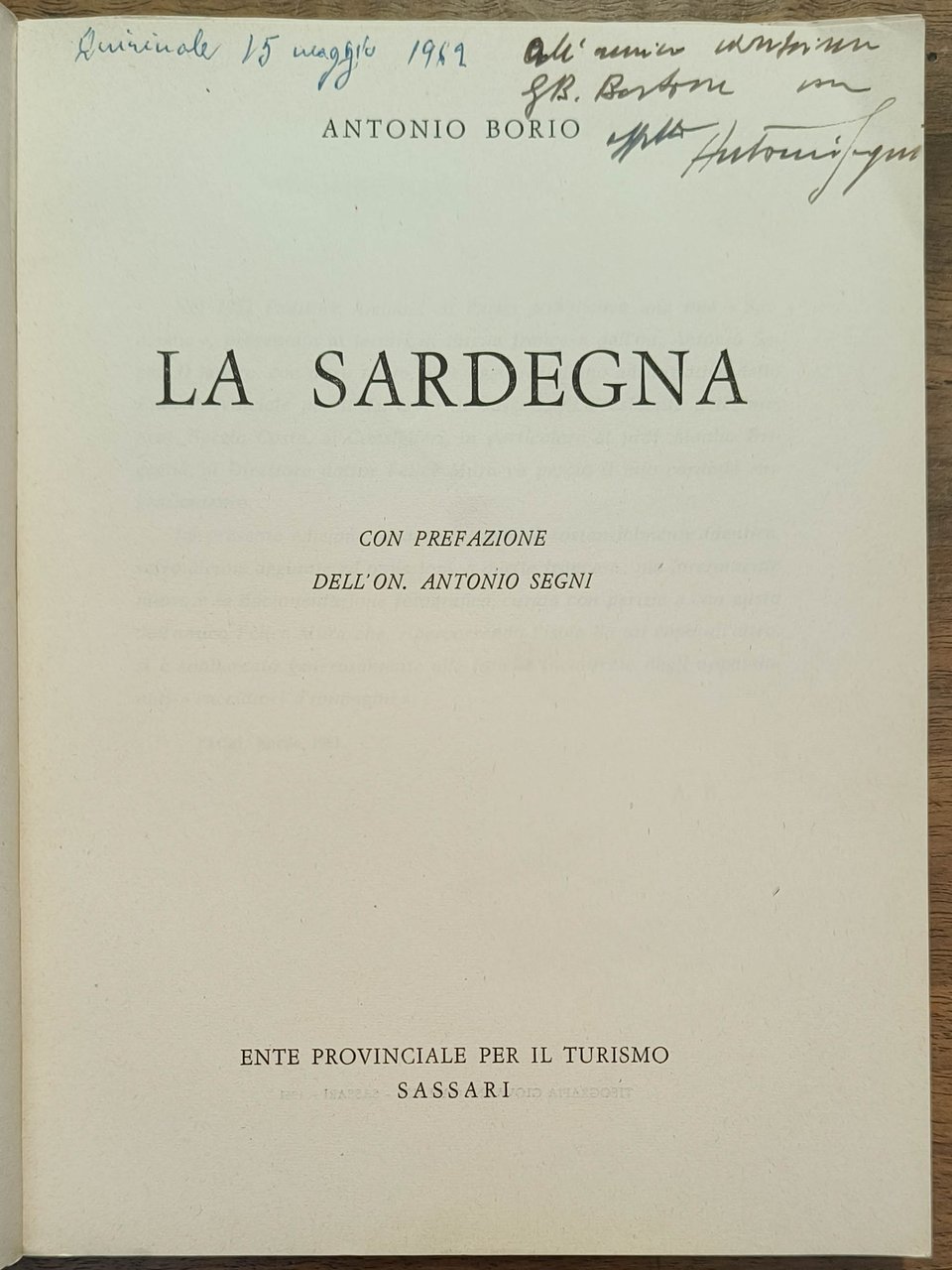 La Sardegna, Sassari, Gallizzi, 1961. Cm 21,7. Pp. 176. Brossura editoriale con sovracoperta illustrata. Segni d'usura alla legatura. 87 fotografie e tavole fuori testo. Prefazione di Antonio Segni. Al frontespizio "Quirinale 1962" e dedica autografa di Antonio Segni all'amico carissimo Giovanni Battista Bertone.