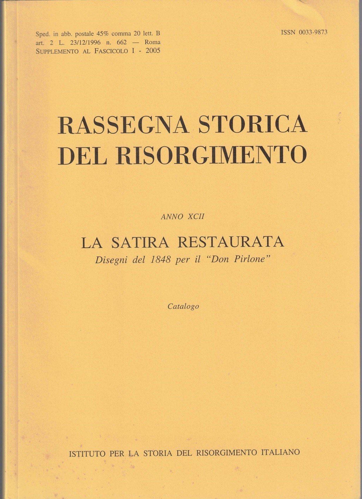 La satira restaurata. Disegni del 1848 per il Don Pirlone, Roma, Museo Centrale del Risorgimento, Ala Brasini, 2 giugno-16 ottobre 2005, a cura di Marco Pizzo, Rassegna storica del Risorgimento, anno XCII, supplemento al fascicolo I, 2005, Istituto per la Storia del Risorgimento Italiano, pp. 39, 31 c. di tavv. f.t. ill. b.n. e col., cm 24, br. ed. Supplemento al fascicolo I, 2005. In testa al frontespizio: Museo Centrale del Risorgimento. Quaderno n. 4. Integrazione del titolo alla prima di copertina: Catalogo. Indice: Marco Pizzo, La satira restaurata. Disegni del 1848 per il Don Pirlone - Maria Pia Critelli, Don Pirlone: un romano a New Orleans - Mario Marino, Le carte dell'Archivio Pinto del Museo Centrale del Risorgimento di Roma - Catalogo. Minime fioriture alla brossura, per il resto perfetto.