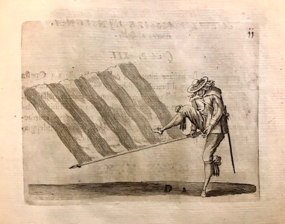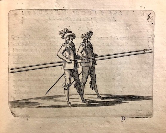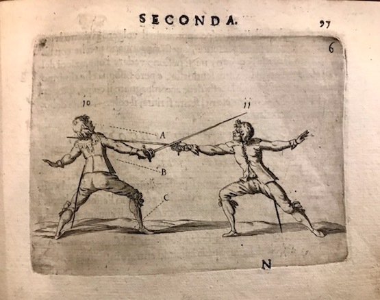 4to formato album (cm. 15x19,5), due Parti: 6 cc.nn. (compresi il frontespizio interamente inciso ed il ritratto dell’A.), 78 pp., 1 c.nn. (frontespizio della Parte seconda), da p. 81 a p. 168. Con 35 illustrazioni calcografiche a piena pagina n.t. (segue) Idem, La Picca e la Bandiera. nella quale si mostra per via di figure una facile, e nuova pratica, & il maneggio, e l’uso di essa, con la difesa della spada, Ibidem 1641, 4 cc.nn. (compresi un’insegna araldica al verso della seconda carta ed il ritratto del dedicatario dell’opera Lodovico di Vidman conte d’Ortemburgh), 39(1) pp. con il ritratto dell’A. e 12 illustrazioni calcografiche a piena pagina n.t. (segue con proprio frontespizio) Idem, La Bandiera nella quale si mostra per via di figure una facile, e nova pratica, & il maneggio, e l’uso di essa, con la difesa della spada, Ibidem 1638, 6 cc.nn. (compresi il ritratto dell’A. ed il ritratto di Lodovico di Vidman), 63(1) pp. con 28 illustrazioni calcografiche a piena pagina n.t. Fregi e capilettera xilografici n.t. Legatura ‘700 in piena pelle con nervi, ricchi fregi e titolo oro su tassello al ds. (minime tracce d’uso marginali). Tagli rossi. Carte di guardia a pettine. Eccellente esemplare. Raccolta di due opere - in prima edizione ed elegante legatura - di Francesco Ferdinando Alfieri Maestro d’Armi presso l’Accademia Delia di Padova, sua città natale. Le incisioni sono state attribuite alla scuola di Callot e sono tra le più affascinanti pubblicate in Italia in materia. Olsckhi, Choix VII, 10166 (con un esemplare mancante di due carte preliminari nella parte de ‘La Bandiera’). Cockle nn. 743 e 764. Non in Br. Libr.