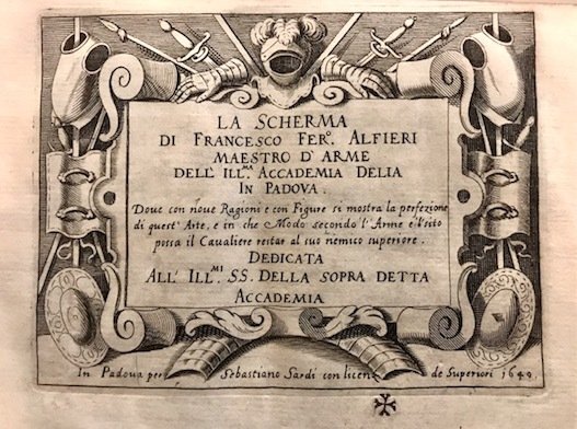 La Scherma di Francesco Fer.o Alfieri Maestro d’Armi dell’Ill.ma Accademia Delia in Padova. Dove con nove ragioni e con figure si mostra la perfezione di quest’Arte, e in che modo secondo l’arme e l’sito possa il Cavaliere restar al suo nemico superiore