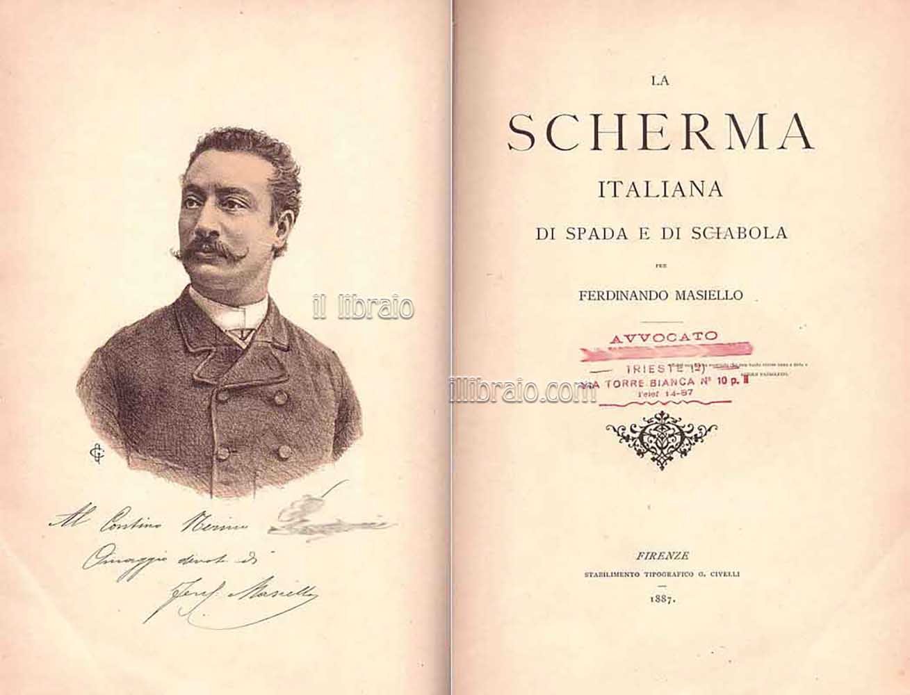 in 8°; pp. XII, 596 + tavv. (ill. in bn.); leg. in mezza tela con angoli, titolo impresso in oro al dorso, piatti marmorizzati. Questa fondamentale opera racchiude, oltre ritratto dell'Autore in litografia e la dedica ai Conti Pietro e Riccardo Bastogi; una prefazione; circa 140 pagine di cenni storici della Scherma - La meccanica della spada - Trattato della spada - Trattato della sciabola - Numerose tavole litografate e specchi sinottici. Decorato con ricchi fregi e capilettera. Nel 1866, a soli 17 anni, il Masiello si arruola nel 72° fanteria, come soldato. Al reggimento, il Tenente Leocani ne assunse l'educazione schermistica insegnandogli il sistema napoletano vecchio. Una stella benefica indicava il cammino della vita al Masiello; il quale, nell'alternativa di diventare maestro elementare, o maestro di scherma, rispose all'invito fattogli dal Ministero della Guerra, Nel 1869 si recò alla scuola di scherma di Parma diretta da Enrichetti dove, dopo due anni di studio fu confermato nella carica di maestro presso la Scuola magistrale di Parma. Fusa la scuola di Parma con quella di Milano (1876), Masiello fu nominato maestro a Milano, dopo avere appreso le teorie di sciabola, dettate dal Radaelli. Soppressa la Scuola magistrale di Milano, in seguito alla morte del Radaelli, si trasferì a Roma per apprendere il nuovo metodo di Parise. *esemplare con dedica autografa dell'autore (cfr. Gelli - Catalogue de la collection d'ouvrages sur l'escrime; p. 49)