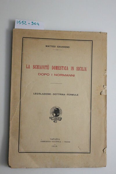 Opuscolo contenente Legislazione - Dottrina - Formule sulla Schiavitù in Sicilia a partire dalle pubblicazioni dell'Avolio e del Bozza. Lo studio dell'autore va più a fondo nella questione cercando di dare nuova luce all'argomento - DETTAGLIO DELLE CONDIZIONI : La coperta è strappata. Pagine ingiallite - (1.XXXI.4).