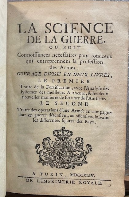 LA SCIENCE DE LA GUERRE OU SOIT CONNOISSANCES NECESSAIRES POUR TOUS ceux qui entreprennent la profession des Armes. Ouvrage divisé en deux livres, le premier traite de la Fortification, avec l'Analyse des systèmes des meilleurs Autheurs, & les deux nouvelles manières de fortifier de l'Autheur. Le second Traite des opérations d'une Armée en campagne soit en guerre défensive, ou offensive, suivant les différentes figures des Pays.