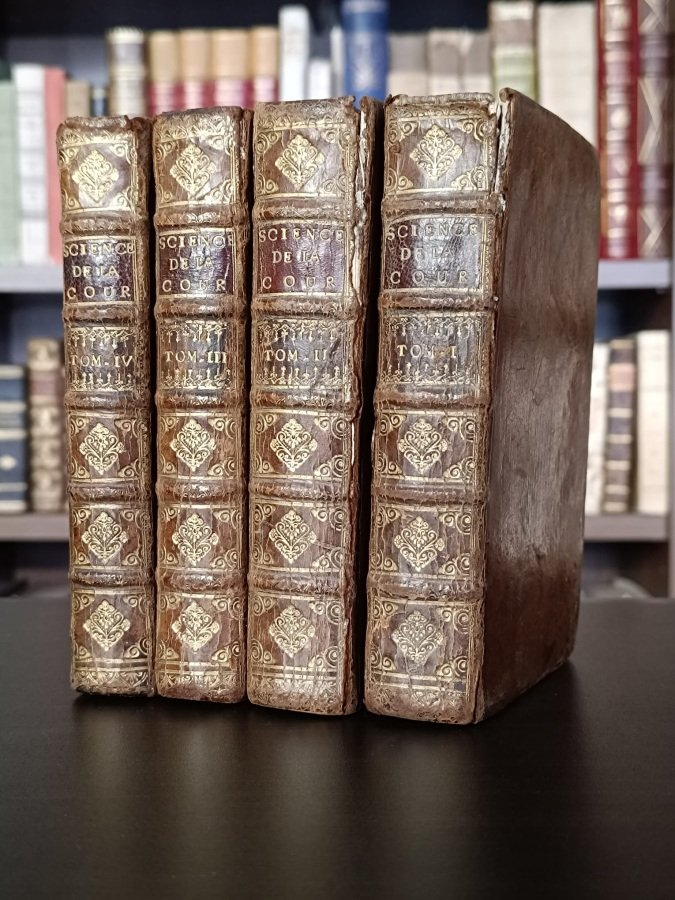 <font face="Arial, Verdana" size="2">4 volumi in-12° (cm. 16), legature coeve in piena bazzana, dorsi a nervi con titolo in oro su tasselli rossi e fregi sempre in oro agli scomparti (mancanza della cuffia al primo tomo, qualche traccia d'usura), tagli spruzzati in rosso; pp. [34] 423 [1b] con 1 antiporta e 17 tavole, [8] 426 [2] con 31 tavole, [4] 384 con 11 tavole, [4] 366 [10] con 8 tavole, in buono stato (alcune fioriture, piccole mancanze alle sole ultime carte del vol. I e al risguardo del vol. IV). Quinta edizione, la prima con le aggiunte di De Limiers. Opera di consultazione di grande successo, una delle prime con impostazione enciclopedica. </font><span style="font-family: Arial, Verdana; font-size: 13.333333px; font-style: normal; font-variant-caps: normal; font-weight: normal;">Riccamente illustrata con un complessivo di 67 tavole più volte ripiegate fuori testo, tra cui carte geografiche e astronomiche; graziose testatine, capilettera e finalini </span><font face="Arial, Verdana" size="2">silografici. Buon esemplare. (NO5)</font>