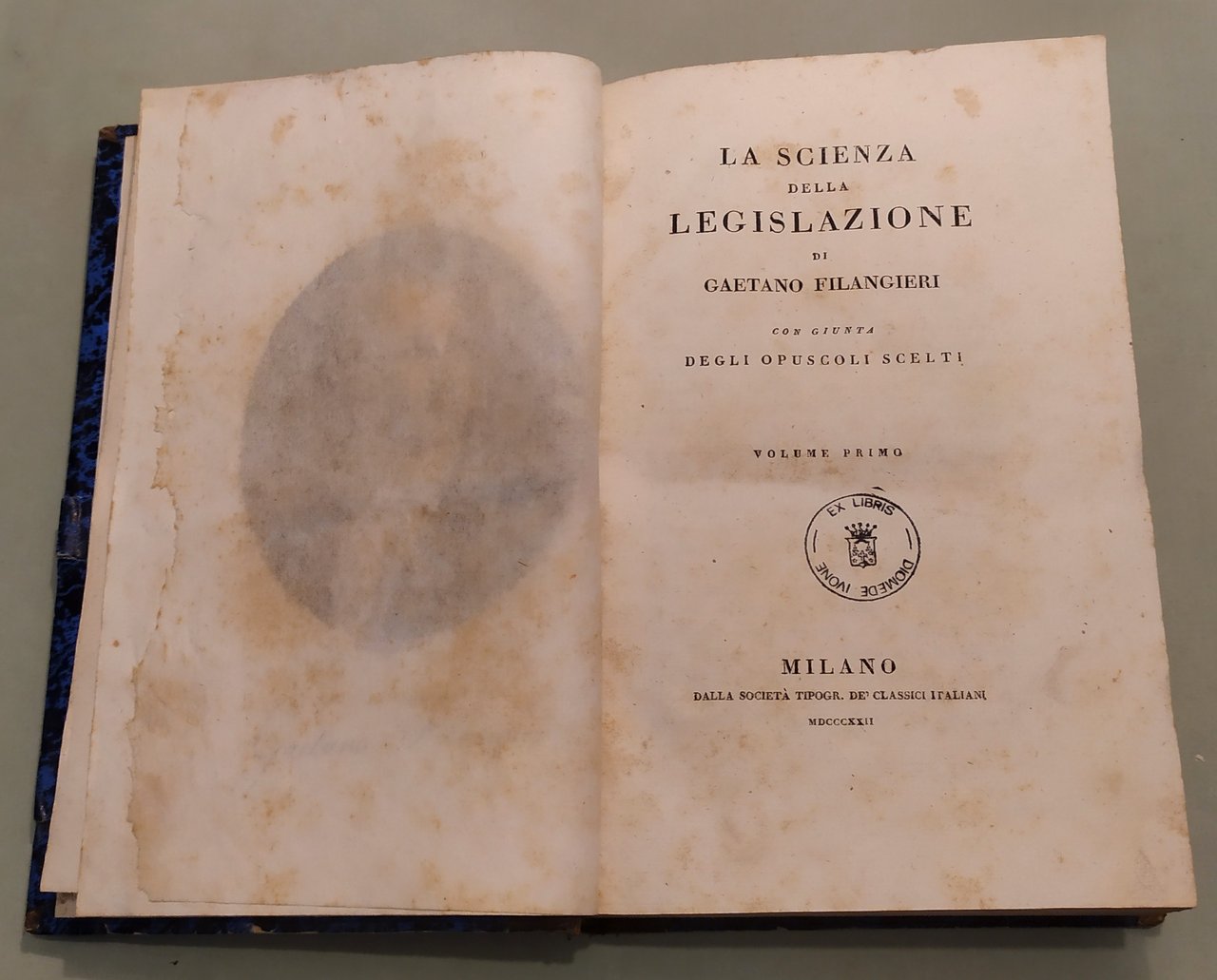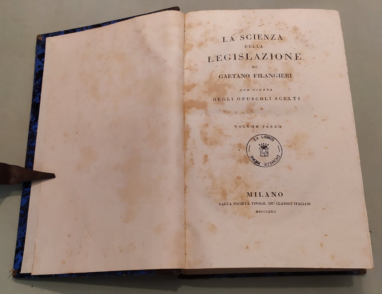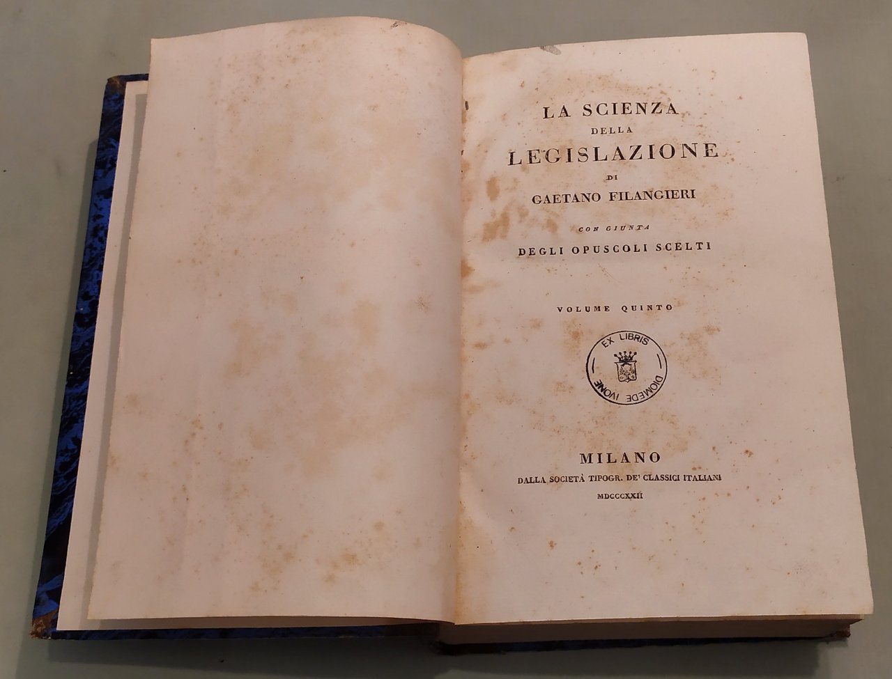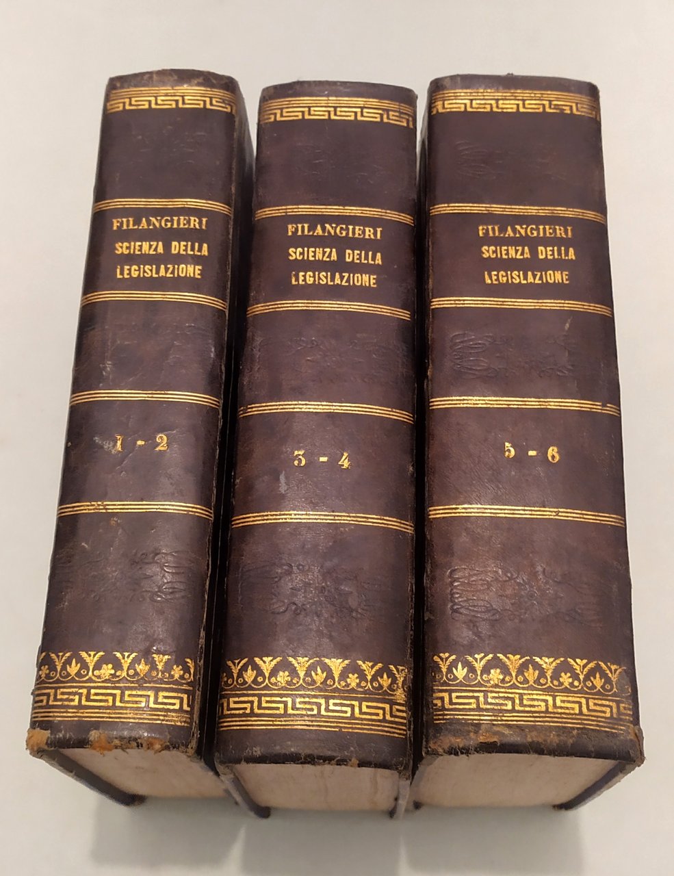 FILANGIERI Gaetano. La Scienza della Legislazione. Con giunta degli opuscoli scelti. Milano, dalla Società Tipogr. De'Classici Italiani, 1822. Sei volumi in tre tomi in 8vo. Ritratto dell’autore al primo volume. Mezza pelle coeva, titolo e fregi in oro ai dorsi. Ex libris. Lievi fioriture. Palgrave II, pag. 59: "Filangeri was one of the most important writers on economics in the latter years of the last century. He did not create a new system, or any new theory; he had a considerable acquaintance with the economical studies of his time, he followed no leader, standing between the physiocratic and mercantilist theory; he sustains the principle of the balance of trade, but he argues for a system of liberty both for exportation and importation tempered only by the opinion that laws ought to be different in countries differently circunstanced; his works are thus the prelude to a historical system of social legislation". Gamba, 2586: "Stimabile edizione. La dizione del Filangeri, che visse soli 36 anni, e morì nel 1788, è incolta, ma l'opera è di tale Italiano, cui andranno sempre debitrici le scienze economiche e le legislative".