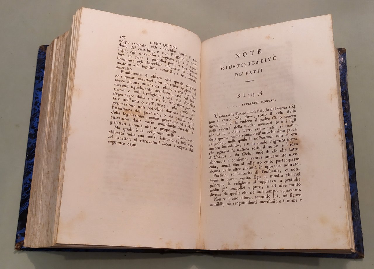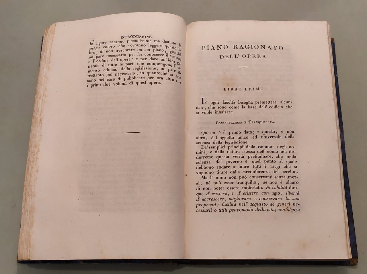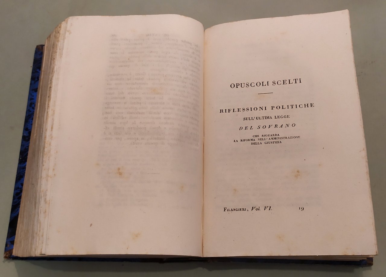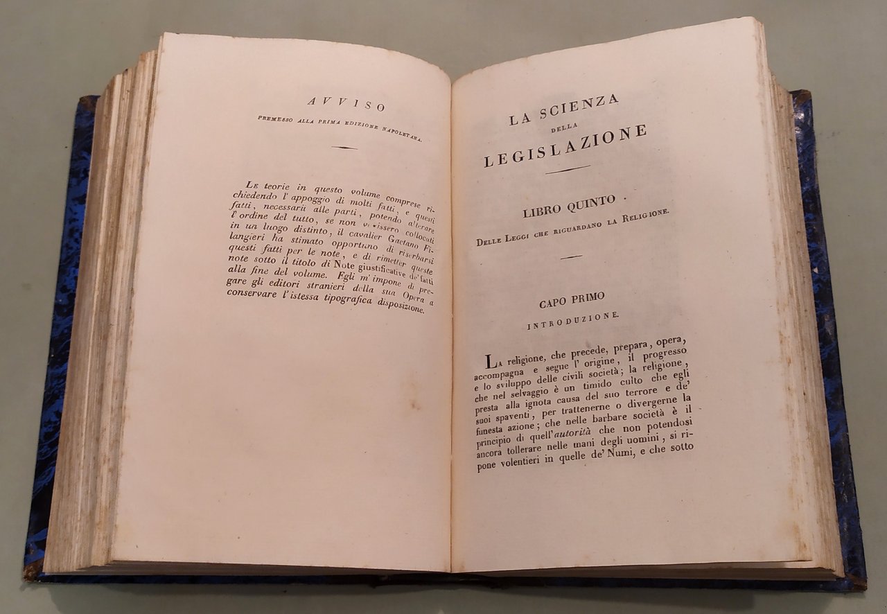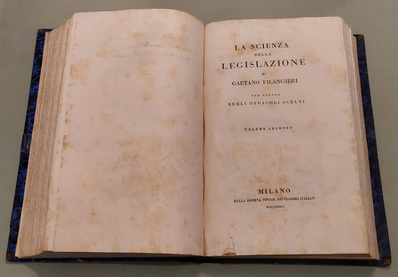 FILANGIERI Gaetano. La Scienza della Legislazione. Con giunta degli opuscoli scelti. Milano, dalla Società Tipogr. De'Classici Italiani, 1822. Sei volumi in tre tomi in 8vo. Ritratto dell’autore al primo volume. Mezza pelle coeva, titolo e fregi in oro ai dorsi. Ex libris. Lievi fioriture. Palgrave II, pag. 59: "Filangeri was one of the most important writers on economics in the latter years of the last century. He did not create a new system, or any new theory; he had a considerable acquaintance with the economical studies of his time, he followed no leader, standing between the physiocratic and mercantilist theory; he sustains the principle of the balance of trade, but he argues for a system of liberty both for exportation and importation tempered only by the opinion that laws ought to be different in countries differently circunstanced; his works are thus the prelude to a historical system of social legislation". Gamba, 2586: "Stimabile edizione. La dizione del Filangeri, che visse soli 36 anni, e morì nel 1788, è incolta, ma l'opera è di tale Italiano, cui andranno sempre debitrici le scienze economiche e le legislative".