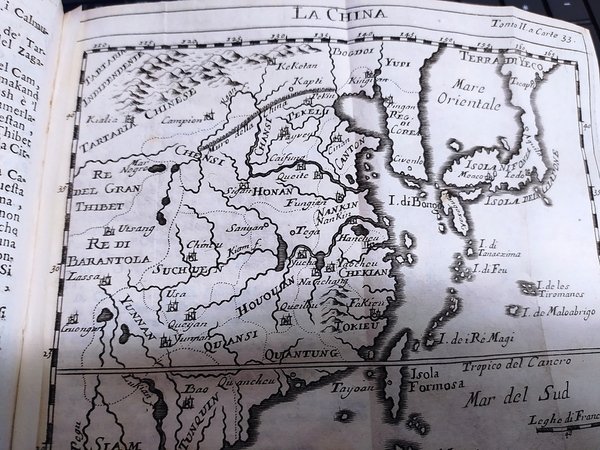 8° (cm. 17,5) piena pergamena coeva, vignette inc. ai frontesp. voll. 3 (di 4, manca il vol. III), pp.(22), 432; (6), 464; IV-388. Con 55 belle tavole ripieg. fuori testo incise in rame raffig. carte geografiche (tra cui un mappamondo, carte dell'Italia, Europa, Cina ecc.), carte astronomiche, storiche ecc. Alcune fiorit. ma buon esempl. Rara ediz. più volte ristampata (la prima ediz. italiana è del 1716).