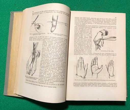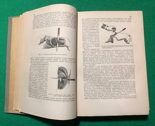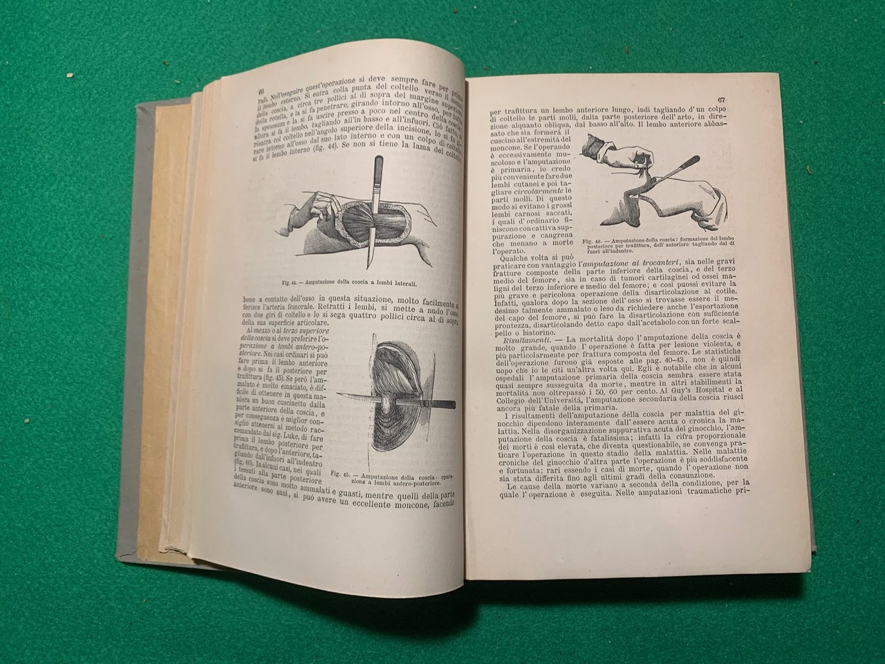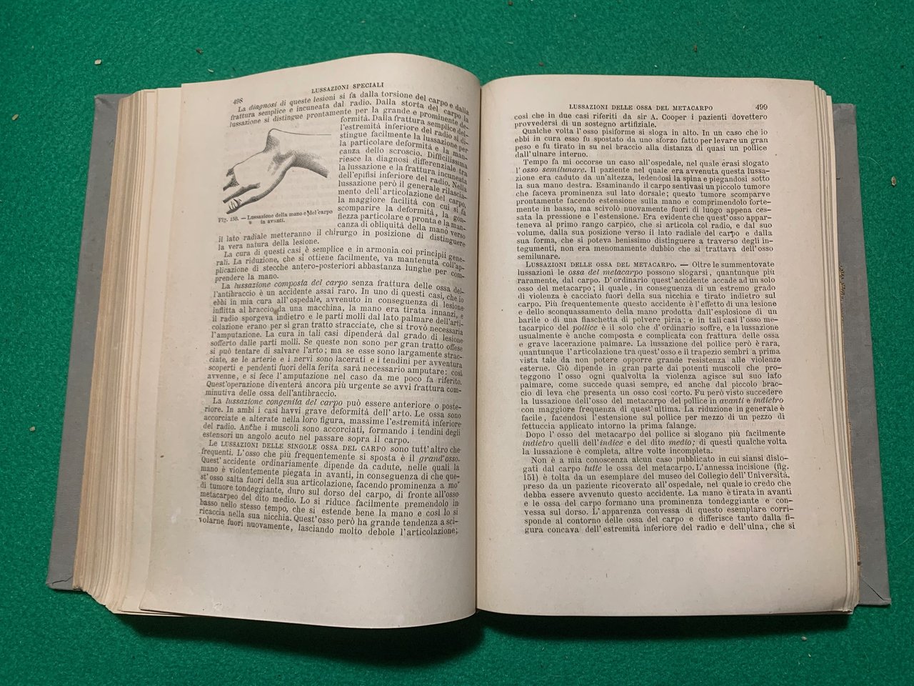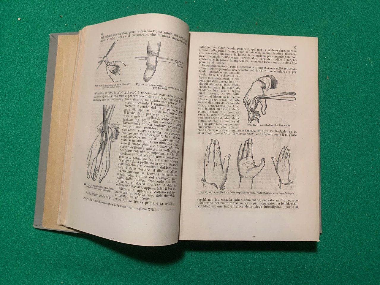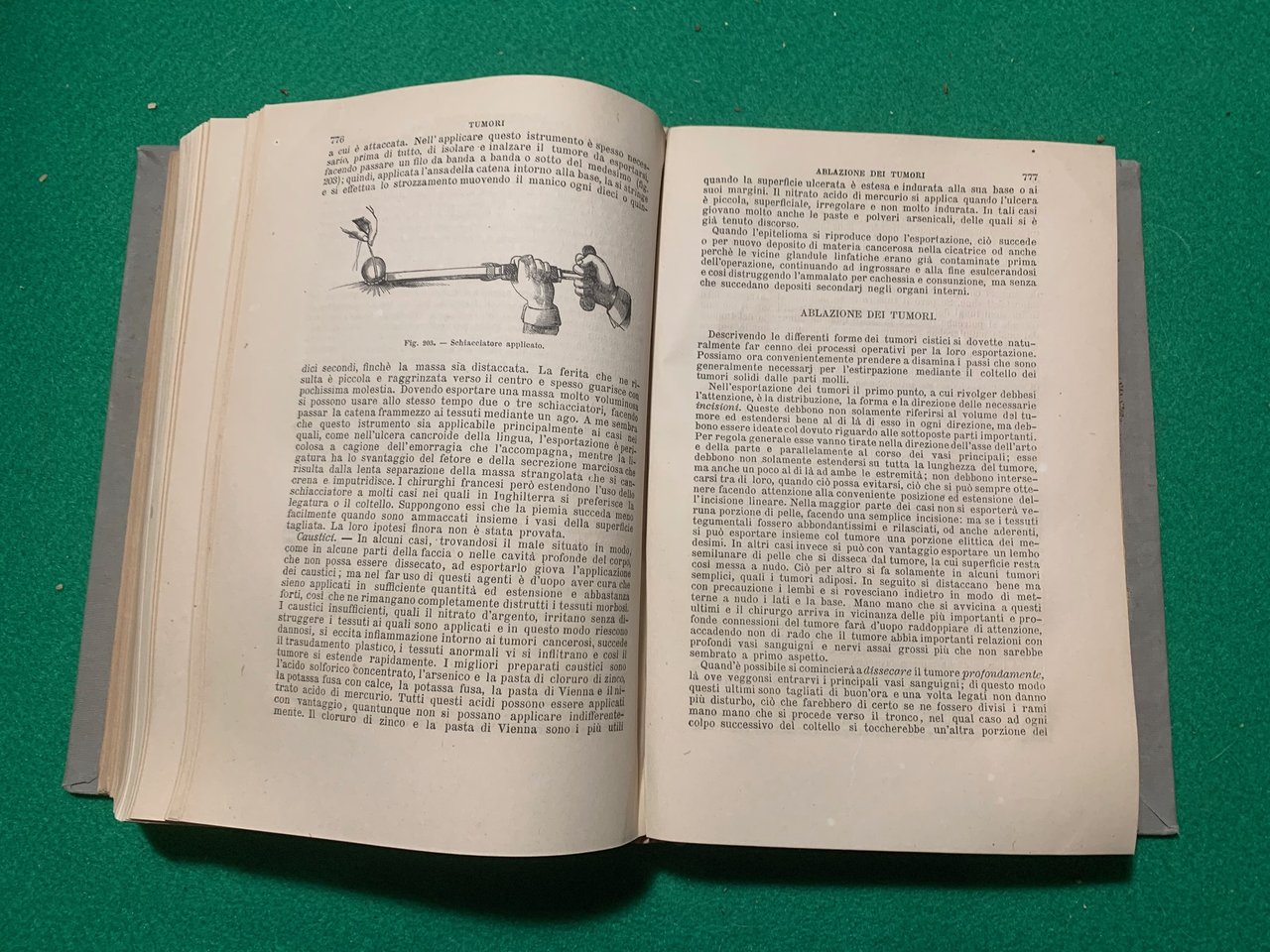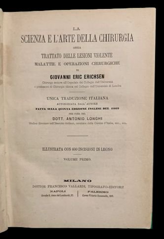 In 8°; due tomi: VIII, 892 pp. e 1087, (1) pp. Belle legature coeve in tutta tela grigia con titolo, numero di volume e fregi in oro ai dorsi. Prima edizione non comune di questo importante testo di chirurgia e pronto soccorso. Jhon Eric eriche è stato un celebre chirurgo inglese ma di origini danesi. Nato a Copenaghen era figlio di Eric Erichsen , membro di una nota famiglia di banchieri danesi. Studiò medicina presso l'University College di Londra e di Parigi , dedicandosi nei primi anni della sua carriera alla fisiologia , e all'insegnamento di anatomia generale e fisiologia presso University College Hospital. Nel 1844 divenne segretario della sezione fisiologica della British Association. Nel 1845 gli venne conferita la medaglia d'oro Fothergillian della Royal Humane Society per il suo saggio sull'asfissia . Nel 1848 è stato nominato assistente chirurgo presso l'University College Hospital , e nel 1850 divenne professore di chirurgia. Le sue lezioni erano molto apprezzate tanto che la sua fama varcò i confini inglesi e studenti da tutta europa venivano ad assistere. Nel giugno del 1876 entrò nella Royal Society . L'opera qui pubblicata aumentò ancor di più la sua fama e venne tradotta in numerose lingue oltre ad avere tantissime riedizioni dopo la prima del 1853. Dal 1879 al 1881 è stato presidente della Royal Medical Society e Chirurgical . Nel 1895 per i suoi meriti gli fu conferito il titolo di Baronetto, dopo essere stato per alcuni anni chirurgo straordinario alla regina Vittoria. Come chirurgo la sua reputazione toccò tutto il mondo ed è considerato come uno dei creatori della moderna chirurgia. Era considerato un luminare delle patologie della colonna vertebrale. Fra le sue frasi celebri si ricordano queste: "There cannot always be fresh fields of conquest by the knife; there must be portions of the human frame that will ever remain sacred from its intrusions, at least in the surgeon's hands. That we have already, if not quite, reached these final limits, there can be little question. The abdomen, the chest, and the brain will be forever shut from the intrusion of the wise and humane surgeon." e " Quando un distinto ma ormai anziano scienziato afferma che qualcosa è possibile, ha quasi certamente ragione quando afferma che qualcosa è impossibile , è molto probabile che sbagli". Morì a Folkestone nel 1896 . L'opera qui presentata è la prima edizione italiana della sua più celebre opera e uno dei testi basilari della chirurgia moderna. L'opera è arricchita da 600 belle incisioni esplicative nel testo e presenta capitoli dedicati anche alla Chirurgia Plastica e della bocca. Esemplare non comune ed in buone-ottime condizioni di conservazione.