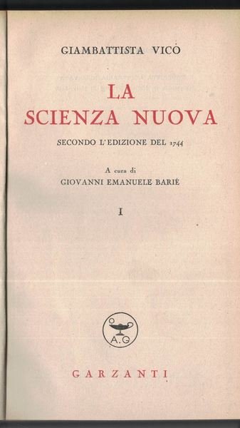 Giambattista Vico, La scienza nuova, secondo l'edizione del 1744 vol.I a cura di G. E. Bariè