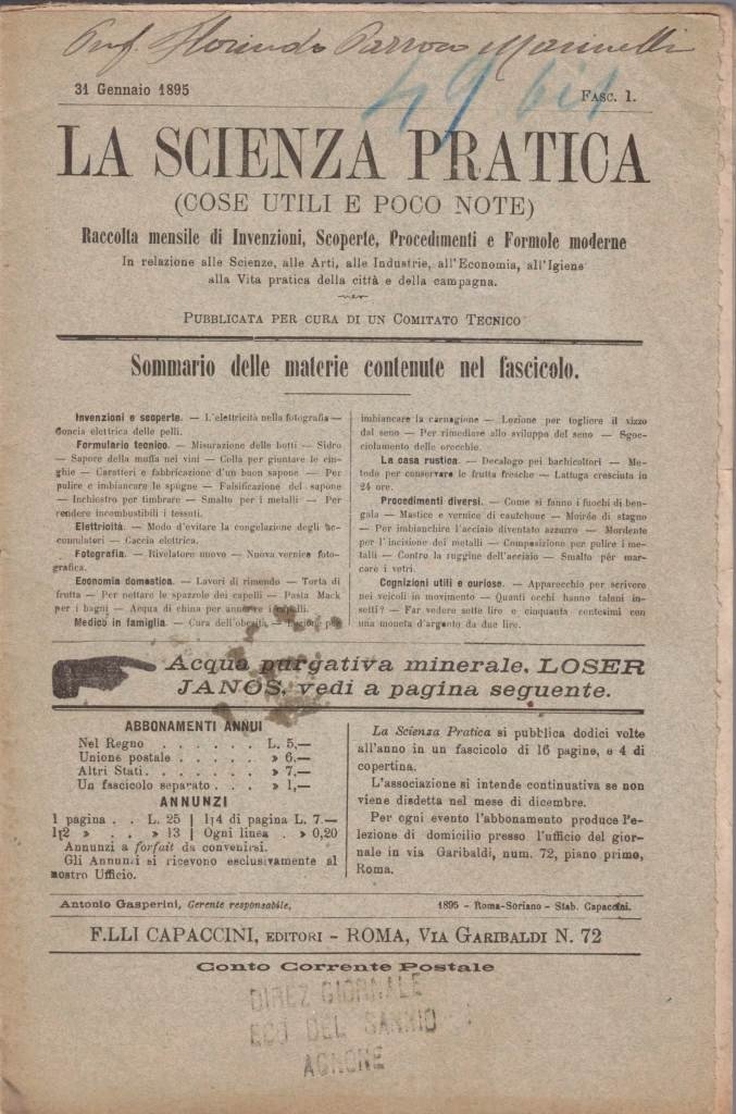 La scienza pratica. Cose Utili e poco note. Raccolta mensile di invenzioni, scoperte, procedimenti e formole moderne. In relazione alle scienze, alle arti, alle industrie, all’economia, all’igiene, alla vita pratica della città e della campagna, pubblicata per cura di un Comitato Tecnico, F. lli Capaccini Editori, Roma, 1895, 6 numeri non consecutivi, pp. 16 cad. per un totale di pp. 96, ill. b.n., cm 24, fascicoli rilegati a punto metallico. Il lotto comprende i seguenti sei fascicoli della rivista La scienza pratica. Cose Utili e poco note, anno 1895: fasc. 1, 31 gennaio 1895, pp. 1-16 – fasc. 5, 31 maggio 1895, pp. 65-80 – fasc. 7, 31 luglio 1895, pp. 97-112 – fasc. 8, agosto 1895,pp. 113-128 – fasc. 9, settembre 1895, pp. 129-144 – fasc. 12, 31 dicembre, pp. 177-192. Indici: Fasc 1. Apparecchio per scrivere nei veicoli in movimento – L’elettricità nella fotografia – Decalogo pei bachicoltori – Concia elettrica delle pelli – Misurazione delle botti – Come si fanno i fuochi di bengala – Mastice e vernice di caoutchouc – Moirèe di stagno – Sapore della muffa nei vini – Sidro – Colla per giuntare le cinghie – Modo d’evitare la congelazione degli accumulatori – Caratteri e fabbricazione d’un buon sapone – Metodo per conservare la frutta fresche – Lavoro di rimendo – Rivelatore nuovo – Nuova vernice fotografica – Quanti occhi hanno taluni insetti? – Lattuga cresciuta in 24 ore – Per imbianchire l’acciaio diventato azzurro – Far vedere sette lire e cinquanta centesimi con una moneta d’argegento da due lire – Mordente per l’incisione sui metalli – Cura dell’obesità – Composizione per pulire i metalli – Contro la ruggine dell’acciaio – Torta di frutta – Caccia elettrica – Smalto per marcare i vetri – Per pulire e imbiancare le spugne – Per nettare le spazzole dei capelli – Pasta mack per i bagni – Lozione per imbianchire la carnagione – Acqua di china per annerire i capelli – Lozione per togliere il vizzo al seno – Falsificazione del sapone – Inchiostro per timbrare – Smalto per metalli – Per rimediare allo sviluppo del seno – Per rendere incombustibili i tessuti – Sgocciolamenti dell’orecchie. Fasc. 5. Scatole di carta o cartone – Consevazione degli erbari – Perché lo zucchero in polvere ha un sapore meno dolce di quello in pezzo? – Mastice da innesto – Vernice d’oro da applicarsi su pezzi caldi – Sull’elettricità delle acque minerali – Le pile elettriche sono applicabili all’illuminazione domestica? – Trasmissione delle fotografie col telegrafo – Colorazione dello stagno – Cemento per attaccare il vetro al metallo – Cera impermeabile nera per bardature – Soluzione per coltivare i fiori nella serra – Limonate – Lozioni contro la calvizie – Procedimento per profumare gli appartamenti – Maniera di impedire all’olio di divenir rancido – Nettamento delle monete e delle medaglie – Processo per scrivere sul vetro con inchiostro ordinario, o con inchiostro di china – Liquore di mandarino – Sciroppo d’orzata – Del caffè – Dieci regole per mungere le vacche – La forzatura degi ortaggi – Le montagne che cantano – I vapori d’alcool conservano le frutta fresche – Esperimenti pratici dell’elettrizzazione del suolo – Vernice colorante per le lastre di latta. Fasc. 7. Un cannocchiale (telescopio) per quindici soldi – Sciroppo di granatina – Poligrafo, velocigrafo, ittiografo, cromografo – Alcune considerazioni sul ferro-chima Bisleri – Pomata contro i geloni – Maniera curiosa di rompere le noci – Distruzione dei corvi – Maniera di trovare il giorno della settimana di una data qualunque – Contro il russare – Applicazione del solfato di rame sugli alberi fruttiferi – Azione dell’olio sui metalli – Vino di aranci – Nettamento dei vetri – Grasso per le armi – Pranzo ad una lira a persona – Un pranzo in venticinque minuti – L’acqua di nocera nell’igiene e nella terapia. Fasc. 8. Modo d’improvvisare un metro – Imitazione delle medaglie antiche – Distruzione delle cattive erbe – Sull’azione del bicarbonato di soda. Sul chimismo gastrico nell’ipopepsia – Metodi per levare le macchie – La noce di kola – Come si guarisce la balbuzie – Vini economici – Fuochi d’artificio in miniatura – Igiene della bocca – Disinfezione delle materie fecali – Formulario per fotografie – Taglio elettrico dei capelli – Macchie di nitrato d’argento – Aceto artificiale – Bagni per la nichelatura dei metalli – Zincatura galvanica degli oggetti di ferro – Mescolanze moschicide – Vetro impermeabile al calore – Nuovo metodo per rendere il latte gradito al palato e digeribile – Modo di bronzare il rame – Vernice per i mobili – Vernice nera per il ferro. Fasc. 9. Sfigmografi economici – Vernice per incisioni su vetro – Maniera di dare agli oggetti di rame il colore del verde antico – Sviluppo all’idrochinone – La stenografia e le sue applicazioni – Metodo pratico per fare il sapone – Le piante e l’elettricità – Colorazione dello zinco – La polvere di carne in commercio – Processo per acciaiare le lastre di rame – Taglio di alberi per far posto ai fili – Colla per il tomaio bianco – Alcool elettrico – Metodo per sterilizzare l’acqua – La cellulosa ottenuta con l’elettrolisi – Preparati lucidi e vernici per il cuoio – Vernice iridescente per le pelli con riflesso variamente colorato – Modo di ottenere lo scheletro delle foglie – Fabbricazione della destrina – Macchie d’olio sul marmo – Per togliere la muffa al vino – Per dare il colore bianco alla seta – Acqua di colonia – Maniera di orientarsi con un orologio da tasca – Vernice per rendere il legno incombustibile e per preservarlo dagli insetti – Maniera di togliere le macchie di olio dalle stoffe – Cemento per attaccare il vetro al metallo – Galattopoietico –