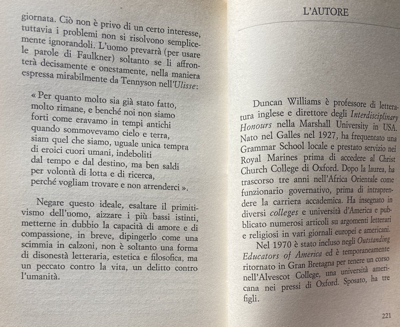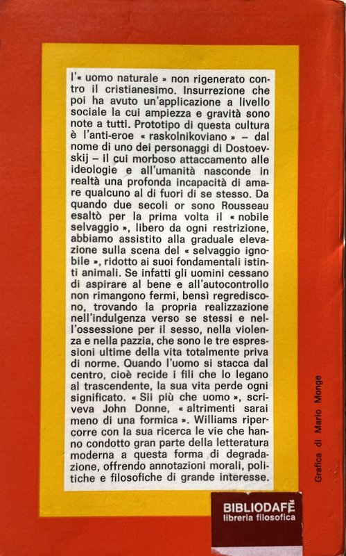 L'uomo naturale non rigenerato contro il cristianesimo. Insurrezione che poi ha avuto un'applicazione a livello sociale la cui ampiezza e gravità sono note a tutti. Prototipo di questa cultura è l'anti-eroe raskolnikoviano, dal nome di uno dei personaggi di Dostoevskij, il cui morboso attaccamento alle ideologie e all'umanità nasconde in realtà una profonda incapacità di amare qualcuno al di fuori di se stesso. Da quando due secoli or sono Rousseau esaltò per la prima volta il nobile selvaggio, libero da ogni restrizione, abbiamo assistito alla graduale elevazione sulla scena del selvaggio ignobile, ridotto ai suoi fondamentali istinti animali. Se infatti gli uomini cessano di aspirare al bene e all'autocontrollo non rimangono fermi, bensì regrediscono, trovando la propria realizzazione nell'indulgenza verso se stessi e nell'ossessione per il sesso, nella violenza e nella pazzia, che sono le tre espressioni ultime della vita totalmente priva di norme. Quando l'uomo si stacca dal centro, cioè recide i fili che lo legano al trascendente, la sua vita perde ogni significato. Sii più che uomo, scriveva John Donne, altrimenti sarai meno di una formica. Williams ripercorre con la sua ricerca le vie che hanno condotto gran parte della letteratura moderna a questa forma di degradazione, offrendo annotazioni morali, politiche e filosofiche di grande interesse.