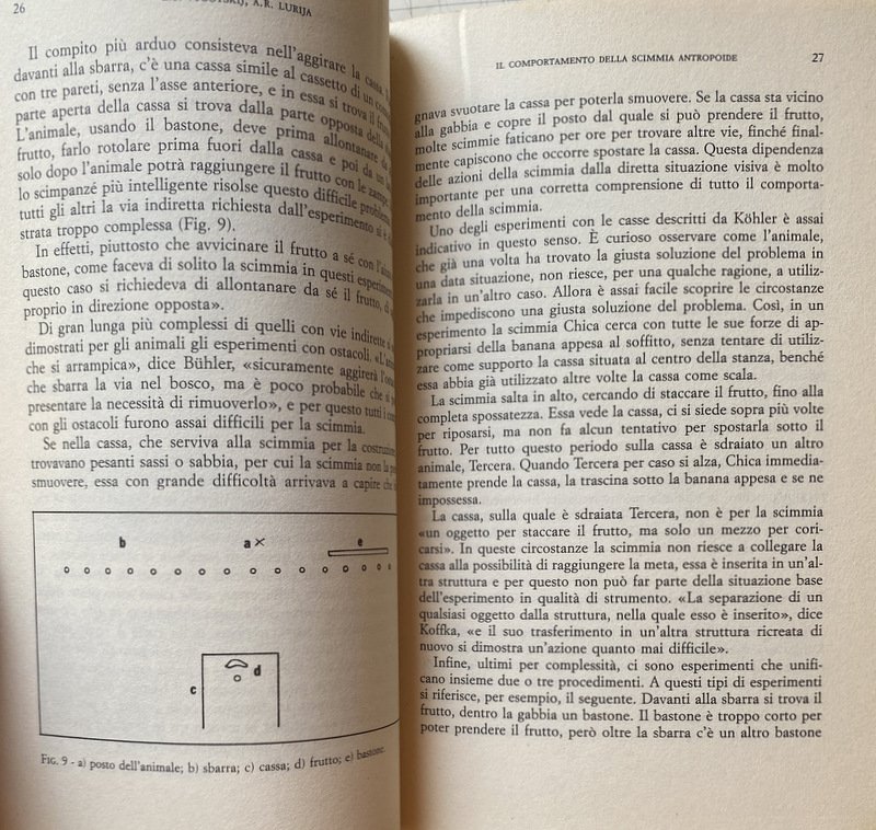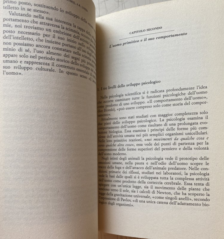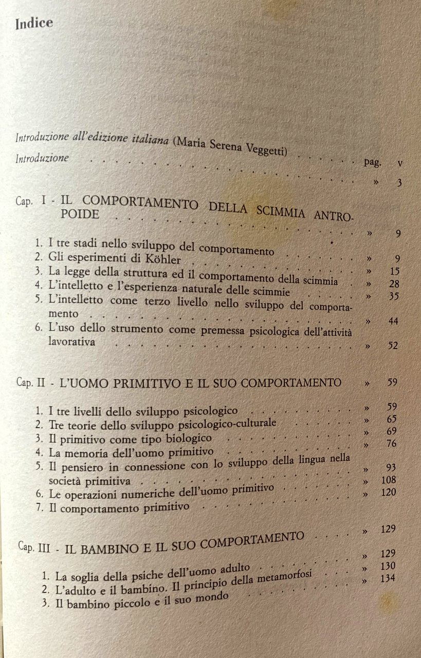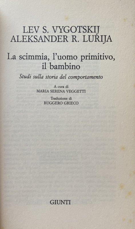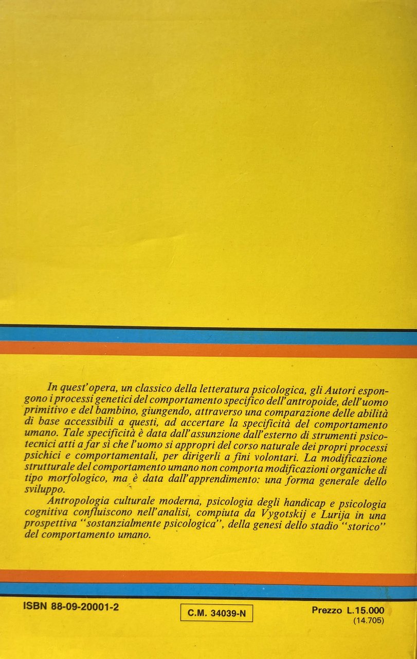 Soggetti: Pedagogia, Filosofia, Antropogenesi, Teoria comportamentale, Ontogenesi, Educazione, Formazione, Etnografia, Antropologia culturale cognitiva, Studi culturali, Comportamento, Esseri umani, Specie, Animali, Uomini primitivi, Storia, Psicologia, Marxismo, Pedagogisti russi, Unione Sovietica, Comunismo, Scienze sociali, Scimmie, Antropomorfismo, Scimmia antropoide, DNA, Genetica, Psicanalisi, Linguistica, Linguaggio verbale, Semiotica, Segni, Segnali, Lingua, Comunicazione, Evoluzione, Teorie evolutive, Psicopedagogia, Apprendimento, Riflessi condizionati, Darwinismo, Scienza, Politica, Società, Sociologia, Jean Piaget, Bambini, Adulti, Imitazione, Biologia, Esperimenti, Meccanismi, Memoria, Cervello, Pensiero, Parola, Percezione, Processi mentali, Significato, Strumenti, Wolfgang Köhler, Malattie, Lucien Lévy-Bruhl, Richard Thurnwald, Max Wertheimer, Leroy, Theodor Wilhelm Danzel, Charles Darwin, Accademia prussiana, Karl Bühler, Scimpanzé, Intelligenza, Emozioni, Relazioni, Specchio, Immagine, Mitologia, Mito, Riti, Rituali, Studies on the history of behavior: Ape, primitive, and child, Pedagogika, Conoscenza, Etnopsicologia, Psychologie, Scrittura, Ragionamento, Bibliografia, Riferimento, Classici, Consultazione, Collezionismo, Libri Vintage fuori catalogo, Soviet Thought, Funzioni psichiche superiori, Materialismo, Dialettica, Antropoidi, Stadio, Adattamento, Sylvia Scribner, Civilizzazione, Civiltà, Primitivismo infantile, Emotività, Logica, Aggressività, Emozioni, Istinto, Bisogni primari, Alimentazione, Cibo, Conteggio, Abilità, Calcolo, Memorizzazione, Associazioni, Tribù, Genesi, Volontà, Vasily Vasilovich Davydov, Georgy Shchedrovitsky, A.N. Leontev, James V. Wertsch, Raccolte di saggi, Filogenesi, Organismo, Sessualità, Attrazione, Capacità innate, Api, Insetti, Pavlov, Reazioni, Formiche, Addestramento, Mammiferi, Insegnamento, Genitori, Esperimenti, Test, Esperienza, Ambiente, Gruppi, Gerarchie, Ostacoli, Problemi, Numeri, Arnesi, Identificazione, America, Asia, Australia, Aborigeni, Maori, Nuova Zelanda, Tasmania, California, Bavenda, Africa, Femmine, Donne, Ruoli, Raoul Allier, Caccia, Indigeni, Indiani, Perù, Ciudi, Giappone, Cina, Tibet, Bolivia, Disegni, Incisioni, Alfabeto, Alfred Binet, Alfred Adler, Frank Hamilton Cushing, Ludwig Edinger, James George Frazer, Engels, Karl Marx, Gustav Jung, Sigmund Freud, Marcel Mauss, Melanie Klein, Karl Groos, Édouard Séguin, Levin, E. Bruner, vom Helmholtz, Lewin, Linneo, Erodoto, William Stern, Georgij Valentinovic Plechanov, Comportamentismo, Immaginazione, Creatività, Esperimenti, Riduzionismo, Zona di sviluppo prossimale, Neurobiologia, Mediazione, Bastone, Giochi, Espressioni, Operazioni logiche, Philosophy, Anthropogenesis, Behavioral theory, Ontogenesis, Education, Training, Ethnography, Cognitive cultural anthropology, Cultural studies, Behavior, Human beings, Species, Animals, Primitive men, History, Psychology, Marxism, Russian pedagogists, Soviet Union, Communism, Social sciences, Monkeys, Anthropomorphism, Genetics, Pedagogy, Psychoanalysis, Linguistics, Verbal language, Semiotics, Signs, Signals, Communication, Evolution, Evolutionary theories, Psychopedagogy, Learning, Conditioned reflexes, Darwinism, Science, Politics, Society, Sociology , Children, Adults, Imitation, Biology, Experiments, Mechanisms, Memory, Brain, Thought, Word, Perception, Mental processes, Meaning, Tools, Diseases, Academy, Chimpanzee, Intelligence, Emotions, Relations, Mirror, Image, Mythology, Myth , Rites, Rituals, Knowledge, Ethnopsychology, Writing, Reasoning, Bibliography, Reference, Classics, Consultation, Collecting, Out-of-print books, Higher psychic functions, Materialism, Dialectic, Anthropoid, Stage, Adaptation, Civilization, Civilization, Infantile primitivism, Emotionality, Logic, Aggression, Emotions, Instinct, Basic needs, Nutrition, Food, Counting, Skill, Calculation, Memorization, Associations, Tribe, Genesis, Will, Collections of essays, Phylogeny, Organism, Sexuality, Attraction, Innate abilities, Bees, Insects, Pavlov, Reactions, Ants, Training, Mammals, Teaching, Parents, Experiments, Experience, Environment, Groups, Hierarchies, Obstacles, Problems, Numbers, Tools, Identification, Aboriginal, New Zealand, Females, Women, Roles, Hunting, Indigenous , Indians, Peru, Japan, China, Drawings, Engravings, Alphabet, Herodotus, Behaviourism, Imagination, Creativity, Experiments, Reductionism, Zone of proximal development, Neurobiology, Mediation, Stick, Games, Expressions, Logical operations