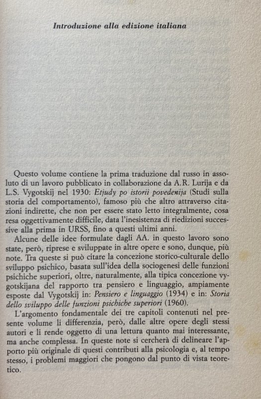 La presente edizione italiana del lavoro di Vygotskij e Lurija è stata resa possibile dalla collaborazione del personale delle biblioteche: V.I. Lenin di Mosca; Universitätsbibliothek della Freie Universität di Berlino Ovest; Biblioteca dell'Istituto di Psicologia della Facoltà di Medicina, Università di Roma.