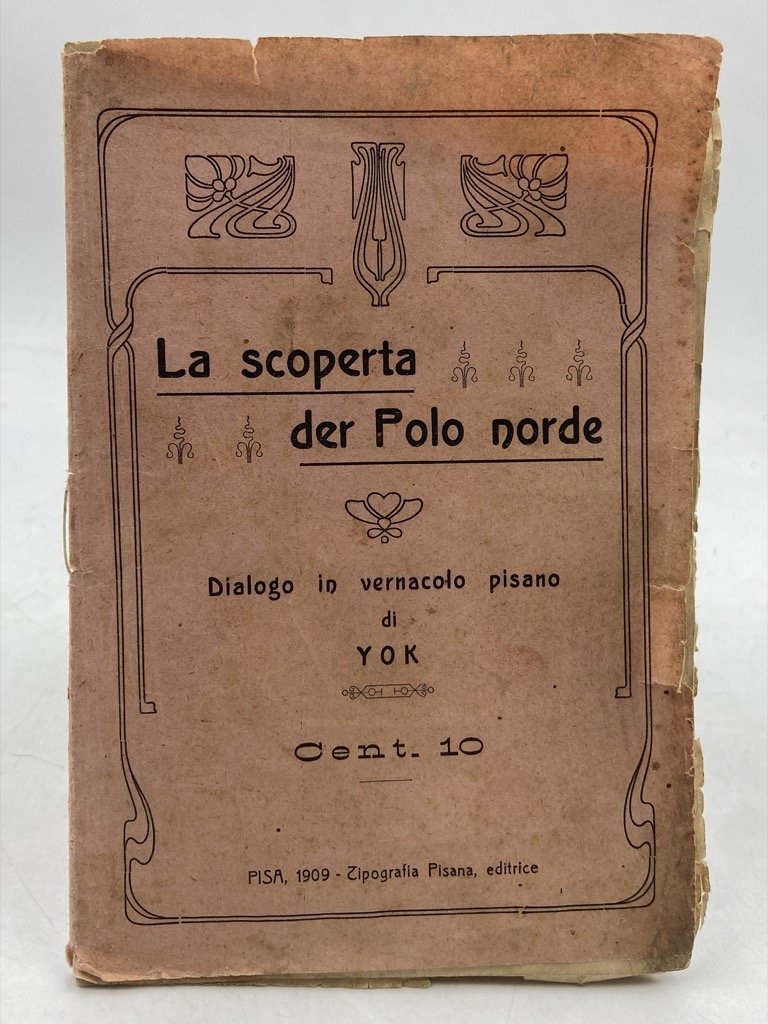 Brossura editoriale a stampa con titoli entro cornici di gusto liberty, in sedicesimo cm 15.5 x 11, pp 12. Edizione assai povera, bordi della brossura usurati, complessivamente ben conservato. Ironico dialogo dedicato a «Cocche» (Frederick Cook) e a «un certo Peorì» (Robert Peary) che «ora si letiano ‘r Polo ’n su giornali»; uno dei due interlocutori espone l’impresa di Cook ad un personaggio, «Pulifemo», assai più interessato alla possibilità di far granite con l'abbondanza dei ghiacci polari. Il discorso si sposta poi sul «ponce» e sul consumo di alcolici, deplorato da «l’inghilesi» della «società di stemperanza» ma non dai nostri dialoganti che decidono di consumare un «moscone» preparato da Dorino, titolare del popolare caffè La Tazza d’oro, certi che con la bevanda si «spieghi meglio la visione der Polo». Arturo Birga (1871 - 1959) fu librettista e autore di romanzi d’appendice apparsi sul Corriere Toscano, nonché di sonetti e novelle in vernacolo pisano pubblicati sotto vari pseudonimi e anagrammi come Agrib, Arrigo Burat, Argia Barturo, Yok, Elios, Argante… (v. Malgoli). Raro, non in ICCU o OCLC. Edizione molto povera, con strappetti sui margini e segni d’uso.