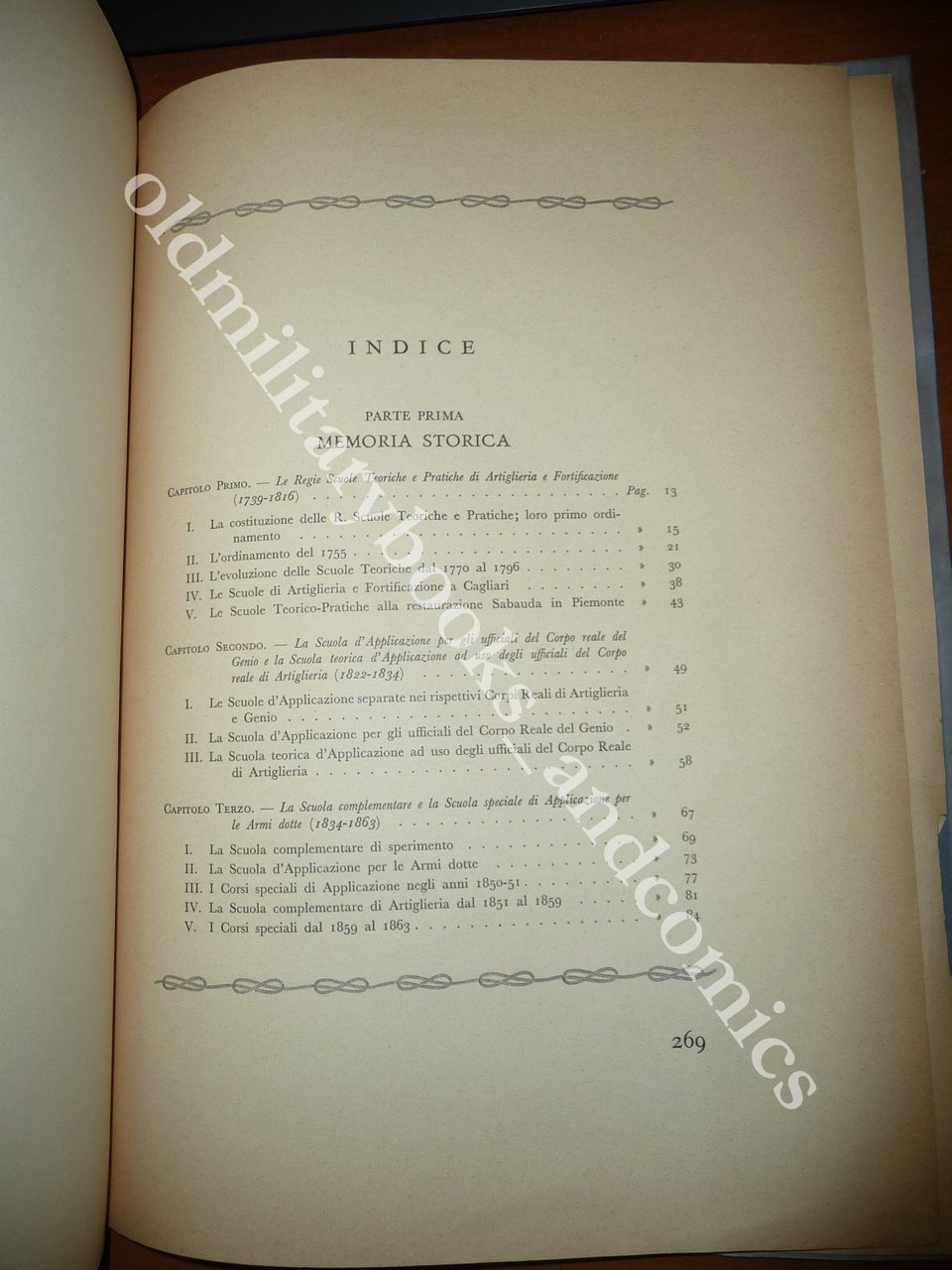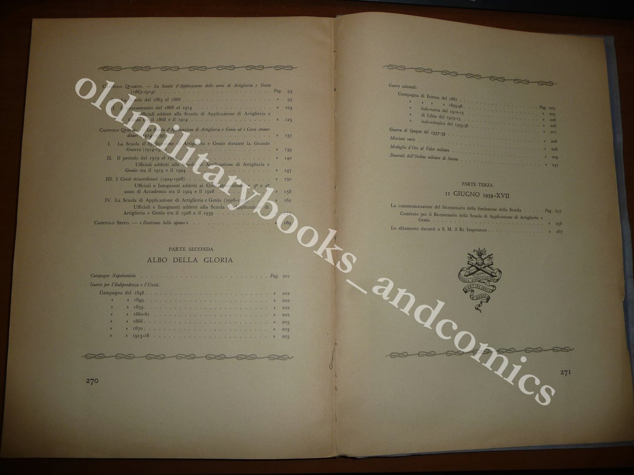 Volume realizzato per il bicentenario della fondazione delle scuole di artiglieria e fortificazione del regno sabaudo. Indice completo in foto. Indice generale: I - Memoria storica; Le regie scuole teoriche e pratiche di artiglieria e fortificazione (1739-1816); La scuola d'applicazione per gli ufficiali del corpo reale del genio e la scuola teorica d'applicazione ad uso degli ufficiali del corpo reale di artiglieria (1822-1834); La scuola complementare e la scuola speciale di applicazione per le armi dotta (1834-1863); La scuola d'applicazione delle armi di artiglieria e genio (1863-1914); La scuola d'applicazione di artiglieria e genio ed i corsi straordinari (1914-1939); Doctrinas bello aptare; II - Albo della gloria; Campagne napoleoniche; Guerre per l'indipendenza e l'unità; Guerre coloniali; Guerra di Spagna del 1937-39; Missioni varie; Medaglie d'Oro al valor militare; Decorati dell'ordine militare di Savoia; III - 11 Giugno 1939-XVII; La Commemorazione del bicentenario della fondazione della scuola; Lo sfilamento davanti a S.M. il Re Imperatore.