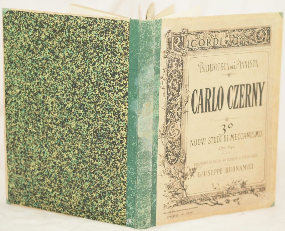In 4. Dim. 30,5x23,5 cm. Pp. 85+53. Bella raccolta di due opere del compositore austriaco insegnante e pianista Carl Czerny (1791-1857). Czerny è noto per le opere di insegnamento di pianoforte, tuttora utilizzate. La prima opera sono quaranta esercizi dell'opera 299 per sviluppare l'agilità delle dita. Timbro a secco illeggibile ma della fine del XIX secolo. La seconda opera del 1895 sono trenta studi di meccanismo per pianoforte dell'opera 849 introduttivi all'opera 299. Edizione diretta, riveduta e diteggiata da Giuseppe Buonamici. Ritratto di Czerny. Note manoscritte. In buone condizioni e completo.Copertina in mezza tela con brossura applicata al piatto anteriore in buone condizioni con usure e macchie ai margini e dorso. Legatura in ottime condizioni. All'interno le pagine si presentano in buone condizioni con fioriture. Restauro marginale nelle pagg. 8, 9 della prima opera senza inficiare il testo. Beautiful collection of two works by the austrian composer teacher and piano player Carl Czerny (1791-1857). Czerny is famosu for his works used for piano teaching, still in use. The first work are 40 exercises of the opera 299 to develop agility in fingers. Unreadable embossed stamp but of the end of XIX century. The second work of 1895 are 30 studies of mechanism of piano of the work 849 introductive to the work 299. Edition directed, reviewed by Giuseppe Buonamici. Portrait of Czerny. Manuscripted notes. In good conditions and complete. Half cloth in good general conditions with wearings and stains in the edges and spine. Binding in very good conditions. Inside pages are in good conditions with foxings. Reastauration in the edges of pages 8, 9 of the first work without ruining the text.