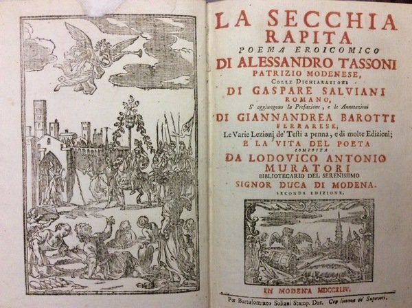 LA SECCHIA RAPITA. - Poema eroicomico colle dichiarazioni di Gaspare Salviani. S'aggiungono la prefazione, e le annotazioni di Giannandrea Barotti; le varie lezioni de' testi a penna, e di molte edizioni; e la vita del poeta composta da L. A. Muratori.