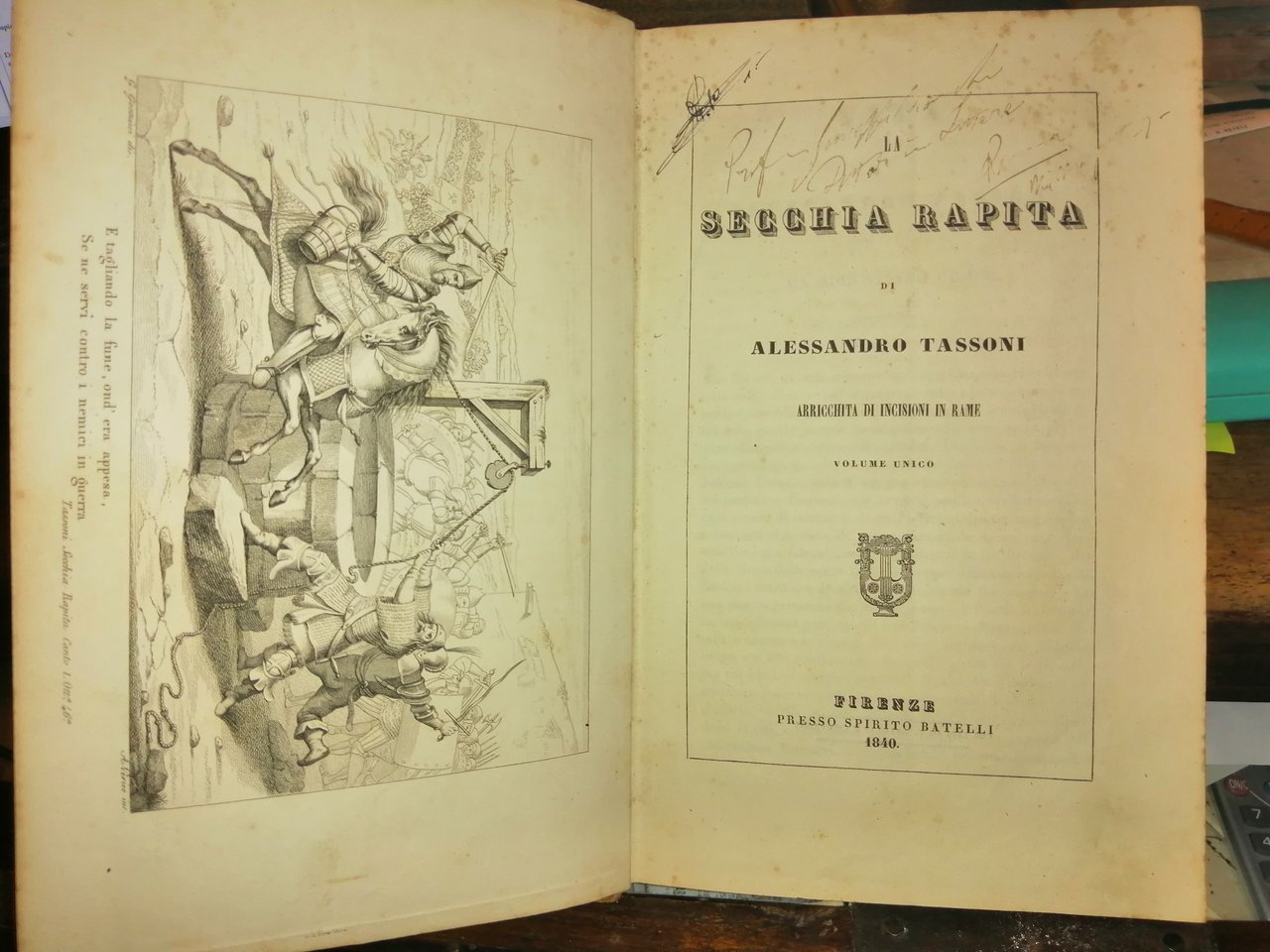 In-4 (24 cm) (1) c. (ritratto in antiporta) (24) c. (di tavole con vignette) (1) c. (tavola ripiegata) 376. Mezza pelle con piatti cartonati rivestiti con carta marmorizzata. Numerose glosse a penna. Tassoni Alessandro (1565-1635). Segretario del cardinale Ascanio Colonna, poi al servizio dei Savoia e del duca Francesco I d'Este. Famoso per il suo poema eroicomico. Nato e morto a Modena.