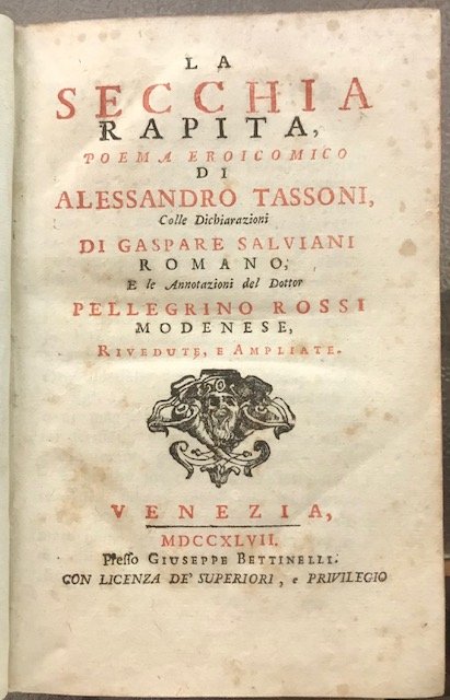 LA SECCHIA RAPITA, POEMA EROICOMICO DI ALESSANDRO TASSONI COLLE DICHIARAZIONI DI GASPARE SALVIANI ROMANO, E LE ANNOTAZIONI DEL DOTTOR PELLEGRINO ROSSI MODENESE RIVEDUTE E AMPLIATE.