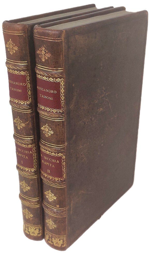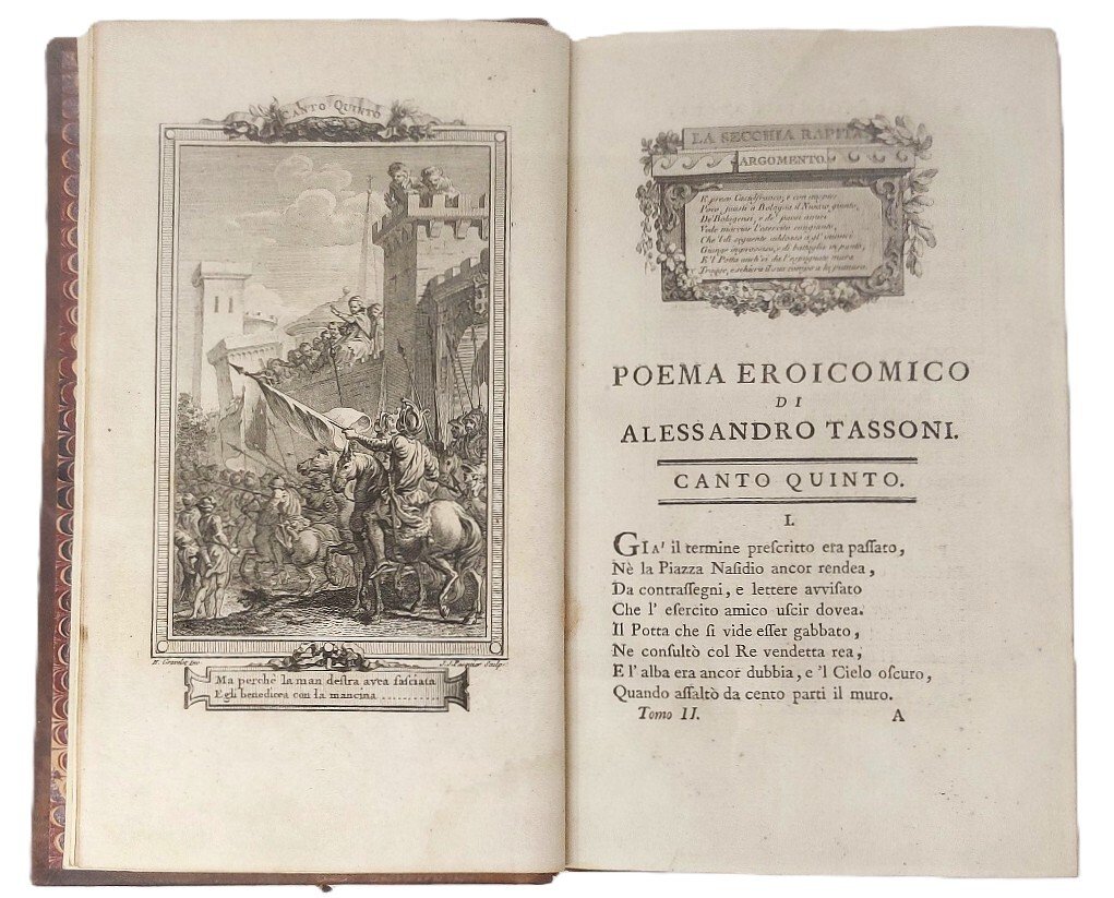 >2 volumi in-8, pp. (4), CVIII, 128; (2), 239, (1); leg. del primo 800 in p. pelle bruna, dorsi a nervi con fregi oro e duplice tassello in pelle granata per i tit. oro. Stupenda edizione illustrata: 2 titoli incisi con differente vignetta, dedica figurata incisa, ritratto in medaglione all'inizio della vita, 12 testate e 12 finalini incisi da Le Roy e 12 belle tavole f.t. finem. incise da Duclos, Nèe, Le Roy, Pasquier, Rosseau e Simonet, il tutto dai disegni di Gravelot. Precedono la Vita dell'autore scritta da L.A.Muratori e le Riflessioni di Pietro Perrault; in fine ad entrambi i volumi le Dichiarazioni dello stesso Tassoni. Com'è noto, "La secchia rapita", composta in ottava rima, pubblicata per la prima volta a Parigi nel 1622, è sicuramente l'opera più famosa di A. Tassoni (Modena 1565-1635) ed uno dei poemi più fortunati e meglio riusciti del genere eroicomico della letteratura italiana. Notissima è la trama: durante una scaramuccia tra bolognesi e modenesi, quest'ultimi riescono a penetrare nel cuore di Bologna dove, assetati, rubano una secchia da un pozzo e, rifiutandone la restituzione, scatenano una complicatissima guerra che si concluderà solo grazie all'intermediazione del legato pontificio. Nonostante l'azione si svolga nel sec. XIII, i riferimenti alla contemporaneità sono numerosi ed espressi con arguzia e vivacità. Ottimo esempl. (i due fogli di titolo lievemente bruniti; timbro nobiliare a secco nel margine del primo). Cohen-Ricci 980-81: «Jolie édition bien illustrée». Boissais-Deleplanque 168. Gamba 2097, note: «Tra le più splendide per lusso tipografico l'edizione di Parigi, Prault, 1766..».