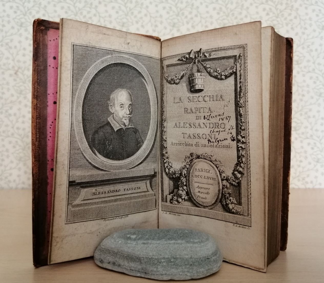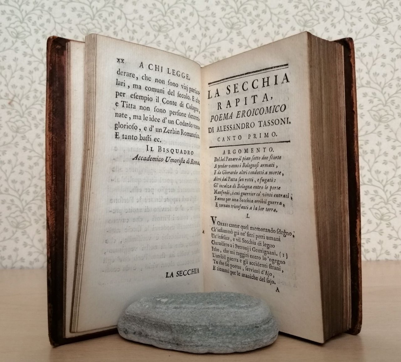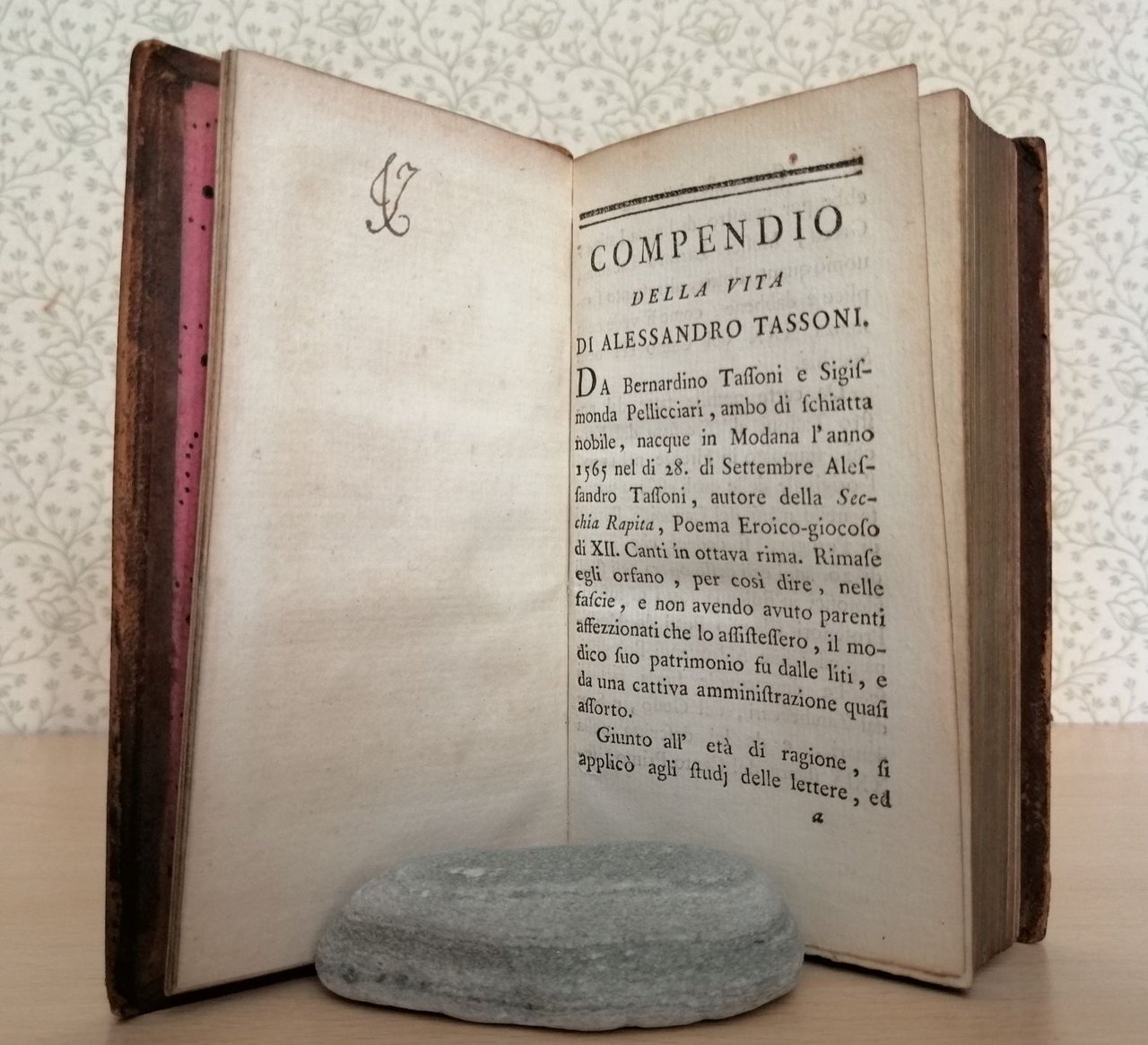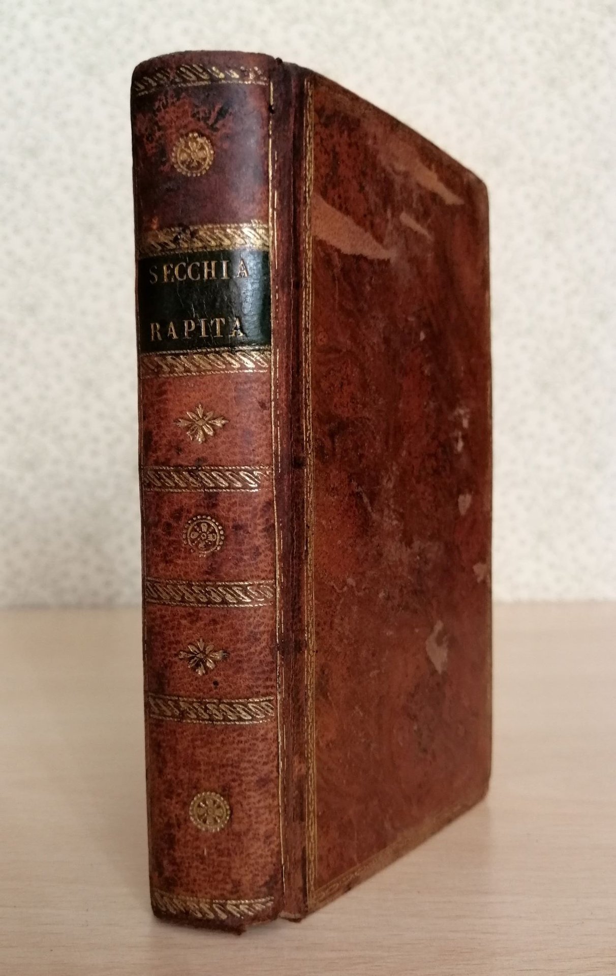 Volume in 12, legato in pelle, piatti inquadrati a secco, dorso a scomparti decorati in oro ai piccoli ferri, titolo al tassello al dorso, sguardie, antiporta illustrato, frontespizio, note biografiche e prefazione dell'autore, XX, 386 pp., termina con 'prefazione di A. T. alle dichiarazioni da lui fatte alla Secchia, sotto il finto nome di Gaspare Salviani' e le 'Dichiarazioni', carta d'approvazione. La storia della guerra che fu tra i Bolognesi ed i Modenesi al tempo dell'Imperatore Federico Secondo per colpa d'una secchia trafugata. Un piccolo gioiellino, in ottimo stato, solo lievi mende d'uso alla legatura, carta fresca, frusciante, forte e bianca, impaginatura e inquadratura perfetta, piccolo ma chiaro e leggibile alfabeto tondo romano. Insomma, delizioso tout court. Raro.