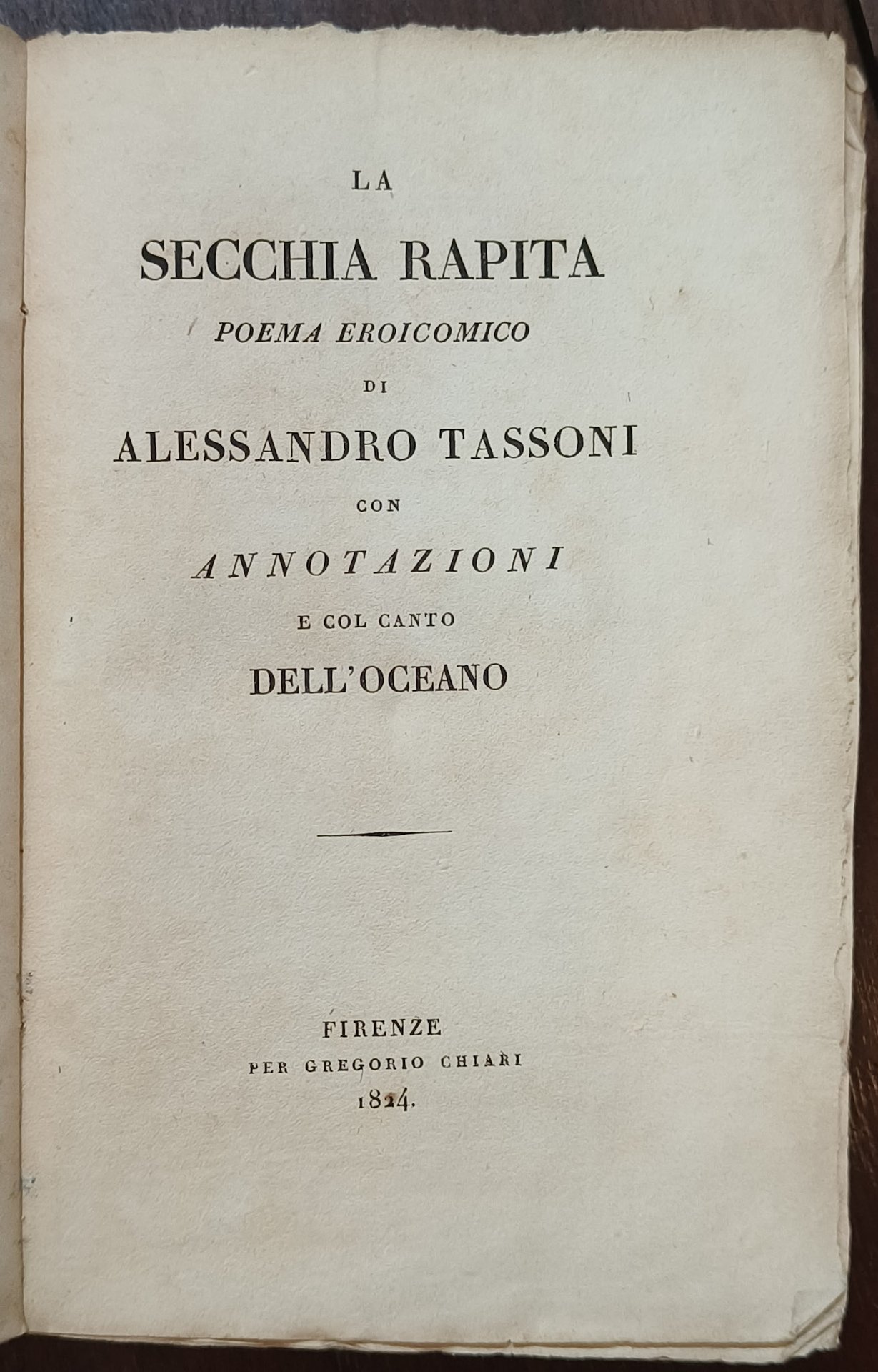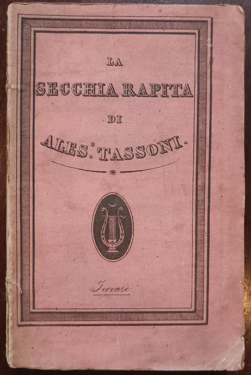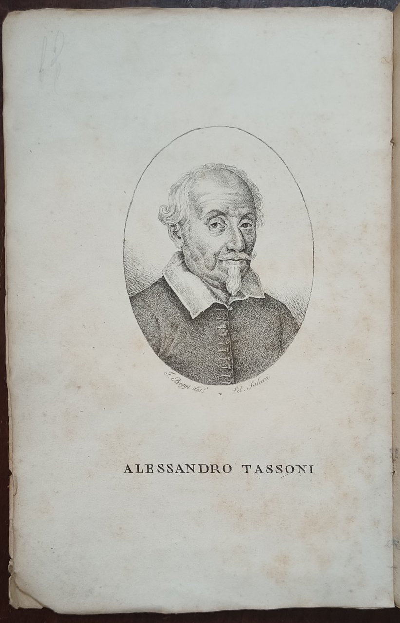 Cm 23,5. Brossura originale figurata in carta rosa d'epoca. Pp. (6) IX 269 (1). Antiporta con ritratto in ovale di F. Boggi stampato dalla litografia Salucci raffigurante Alessandro Tassoni. Tracce di usura, scoloritura al solo dorso. Contiene una biografia dell'autore scritta da Girolamo Tiraboschi e il Canto dell'Oceano.