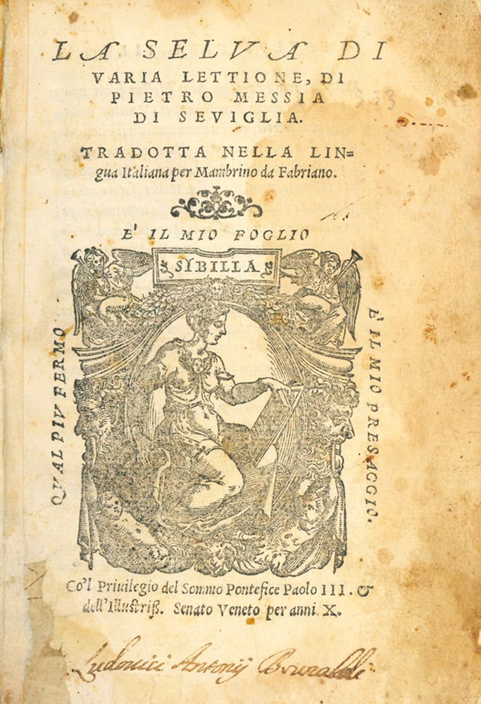 MANIFESTOSeconda edizione, dopo la prima del 1544.Esemplare buono, con restauri alle prime carte e ampi ma leggeri aloni, che non precludono la lettura del testo. Note marginali di mano antica.Una delle opere maggiori dello storico Pedro Mexia, cronista di Carlo V, che raccoglie qui una grande messe di articoli di erudizione sulle più svariate materie: suonano come bizzarre curiosità, ma sono insieme fonte utilissima e di grande interesse per conoscere le credenze del tempo («La ragione perché era più longa anticamente la vita degli humini», Dell’ordine, et cavalleria de i templari», «Quanto sia necessaria l’acqua alla vita humana», «Quanto fusse utile la invenzione delle lettere, et da chi furono trovate», etc.). -- L’edizione, la seconda in italiano dopo quella pubblicata sempre da Tramezzino nel 1544, risulta di grande rarità, non censita nell’Opac Sbn.