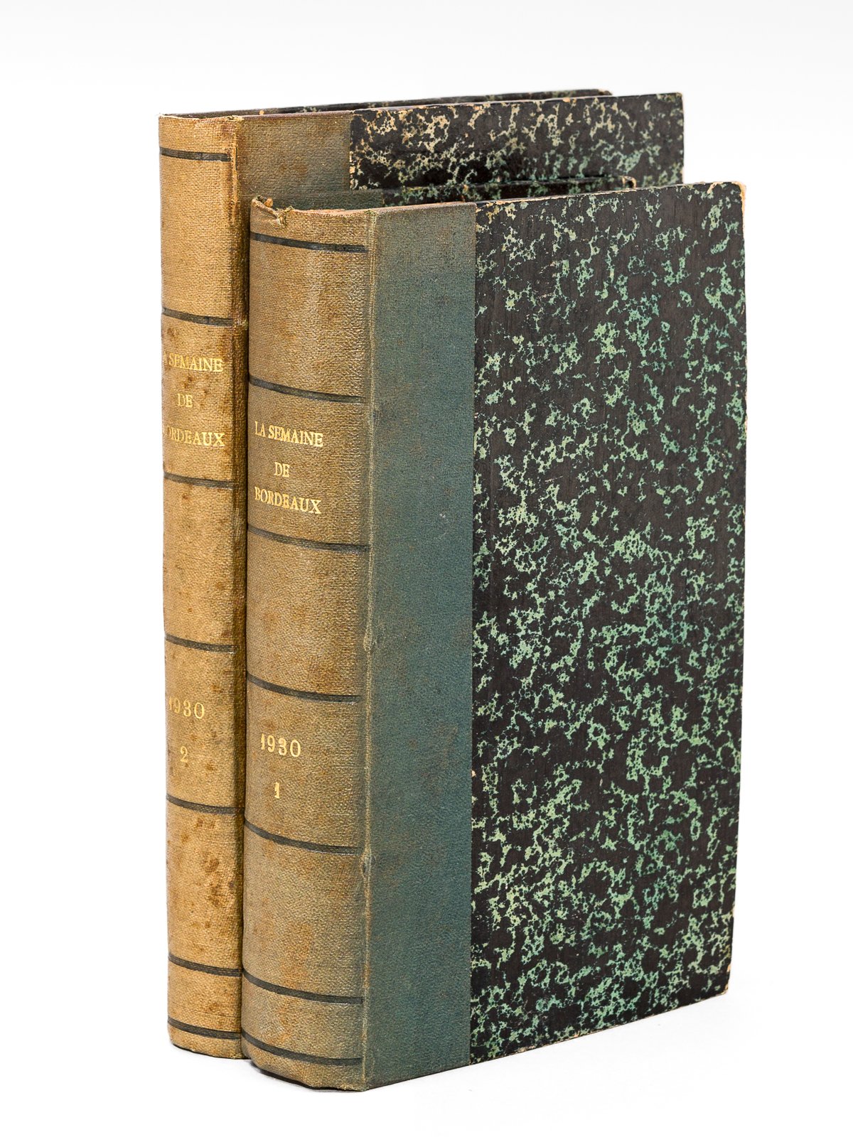 2 vol. in-8 reliure demi-percaline verte, couvertures conservées, La Semaine de Bordeaux. Revue Hebdomadaire des Théâtres. 14e année (Du n°630 du 5 septembre 1930 au n° 655 du 25 décembre 1930) L'ensemble est bien complet des 51 numéros de l'année 1930 (parfois plusieurs numéros par livraison). Les formats des deux volumes diffèrent et suivent le changement de format opéré lors de l'été 1930. Bon état (dos lég. frotté).