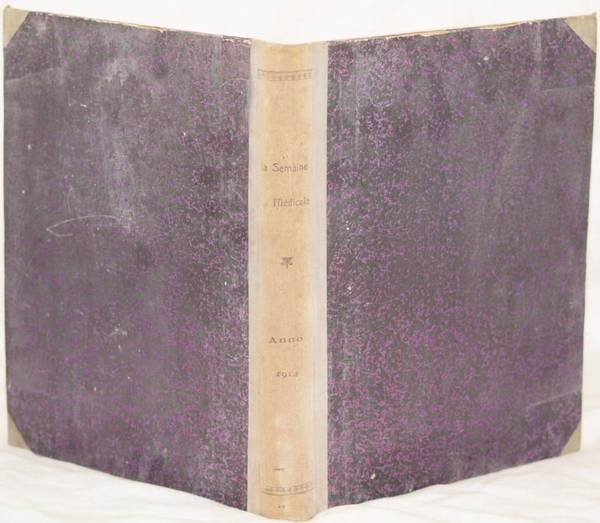 In folio. Dim. 36,5x27,5 cm. Pp. 635+(1). Peso Kg. 2,200.Rara raccolta completa dell'anno 1912 della rivista medica settimanale "La semaine medicale". All'interno articoli di chirurgia pratica, patologia, lavori originali di vari campi della medicina. Tra gli articoli presenti: Trattamento sperimentale del cancro, chirurgia dei polmoni, Frattura del cranio, trattamento dell'artrite, ulcera del duodeno, trattamento dell'alcolismo cronico, peritonite, nuovi risultati sulla vita permanente di tessuti separati dell'organismo, coagulazione del sangue, trattamento chirurgico dell'incontinenza, lesioni cutanee provocate dalla radioterapia, isterectomia contro le emorragie post partum, la scarlattina sperimentale ecc. Qualche illustrazione all'interno in bianco e nero e foto di operazioni chirurgiche, patologie e pazienti. Insieme al volume appunti manoscritti del vecchio proprietario. In buone condizioni. Copertina in mezza tela in discrete condizioni generali con usure e parti mancanti ai margini e dorso. Legatura in buone condizioni. Pagine in buone condizioni con fioriture. Scarce complete collection of year 1912 of the weekly medical magazine "La semaine medicale". Inside articles of practical surgery, pathology in different fields of medicine. Between the articles inside: Experimental treatment of cancer, surgery of loans, Crack of crane, treatment of arthritis, treatment of chronical alcoholism, peritonitis, new results about permanent life of tissues separated by organism, coagulation of blood, surgical treatment of incontinence, skin lesions provoqued by radiotherapy, hysterectomy againt post partum hemorragies ecc. In the text black and white illustrations and photoes representing deseases, patients and surgical operations. In good conditions. Half cloth cover in good general conditions with wearings and missing parts in the edges and spine. Binding in good conditions. Inside pages are in good conditions with foxings.