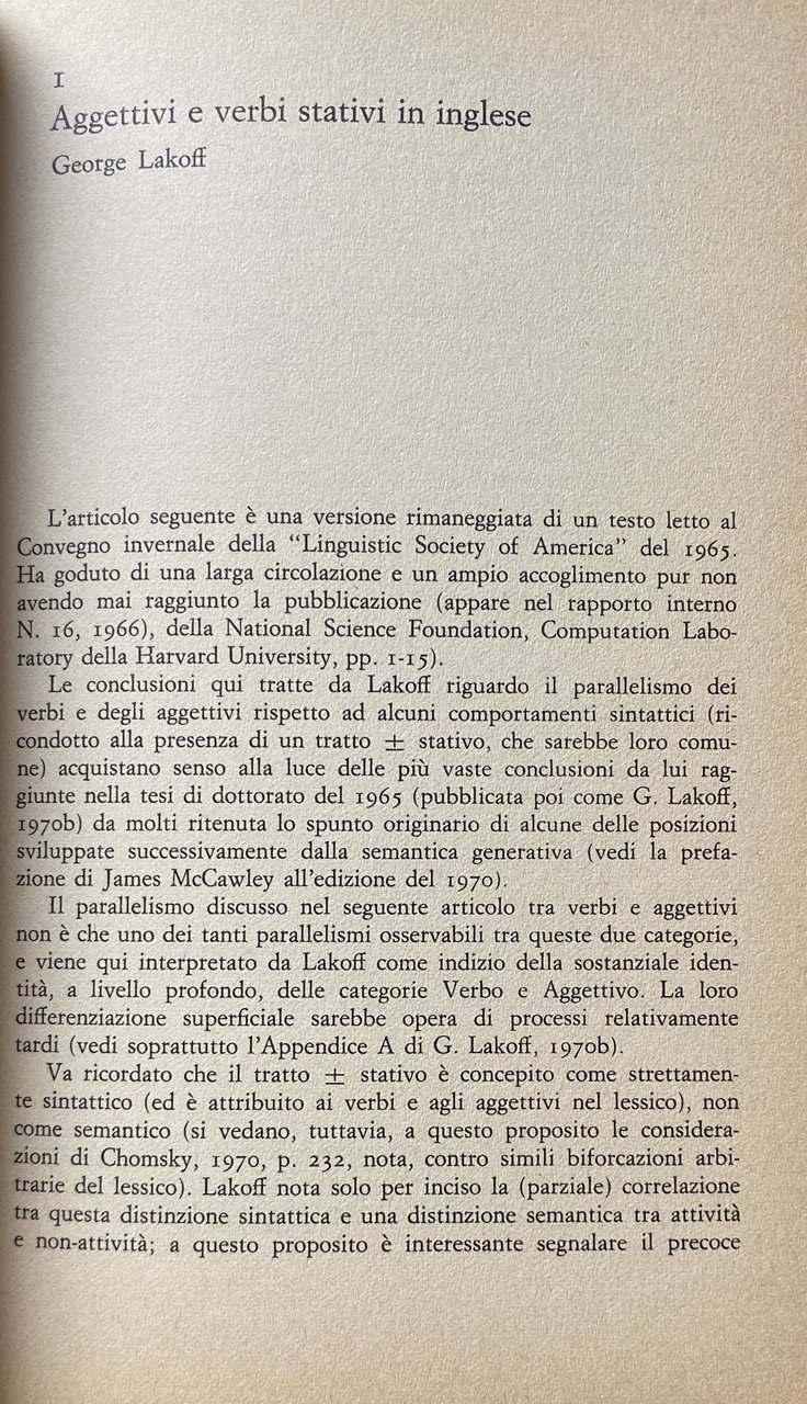 Soggetti: Linguistica, Studi culturali, Semantica, Semiologia, Filosofia, Teoria, Sintassi, Semiotica, Grammatica trasformazionale, Noam Chomsky, Lingue, Inglese, Figure retoriche, Gioco, Competenze linguistiche, Scrittura, Orale, Regole, Norme, Negazione, Frasi, Aggettivi, Verbi, Categorie, Terminologia, Termini, Sostantivi, Nomi, Bibliografia, Riferimento, Libri rari fuori catalogo, Saggi, Pronomi, Avverbi, Isole anaforiche, Ausiliari, Coniugazione, Trasmissione, Caratterizzazione, Chomskiana, Componente sintattico, Concetto, Contesto, Verità, Definizioni, Enunciato, Derivazione, Descrizione, Elementi lessicali, Lessico, Donne, Epistemologia, Equivalenza, Espressioni, Jerry Fodor, Jerrold Katz, Forma, Guerra, Stile, Logica, Funzione, Genere, Grammatica generativa, Trasformazionale, Indicatori semantici sintattici, Interpretazione, Critica, Intuito, Lettura, James David McCawley, Metalinguaggio, Morfemi, Nixon, Nozione, Parlante, Questione, Rappresentazione, Relazioni, Restrizioni, Derivazionali, Selettive, Russell, Sequenza, Significato, Simbolo, Sintagmatici, Sistema formale, Stringa, Struttura, Superficiale, Tarski, Trasformazioni, Metafora, Teorie cognitive, Vincoli, Papers, Seminari, Lezioni, Emmon Bach, Adrian Akmajian, Mark Aronoff, Arlene Berman, Joan Bresnan, Georgia Green, Charles J. Fillmore, J. Emonds, Ray C. Dougherty, Peter Rosenbaum, Thomas A. Wasow, J. Morgan, David M. Perlmutter, J. Greenberg, Ray Jackendoff, Edward Klima, María Luisa Rivero, J. Gruber, John Grinder, Sociolinguistica, Neurolinguistica, Manuali, Testi, Clause-mate, Conversazione, Cancellazione, Attacco, Anteposizione, Tag, Domanda, Estraposizione, Sluicing, Troncamento, Predicato, Transderivazionali, Inversione, Ordine, Parole, Lemmi, Interrogativa, Movimento, Globali, Meccanismi, Metonimia, Spazio mentale, Letteratura, Esempi pratici, Guide, Spagnolo, Stativi, Berkeley, Università, John Lyons, Kuroda Linguistics Cultural studies Semantics Semiology Philosophy Theory Syntax Semiotics Transformational grammar Languages English Figures of speech Game Language skills, Writing Rules Norms Negation Phrases Adjectives Verbs, Categories Terminology Terms Nouns Names Bibliography Reference Rare books out of print Essays Pronouns Adverbs Anaphoric islands Auxiliaries Conjugation Transmission Characterization Syntactic component Concept Context Truth Definitions Statement Derivation Description Elements lexical Lexicon Women Epistemology Equivalence Expressions Shape War Style Function Gender Generative Transformational Syntactic semantic indicators Interpretation Criticism Intuition Reading Metalanguage Morphemes Notion Speaker Question Representation Relations Restrictions Derivational Selective Sequence Meaning Symbol Syntagmatic Formal system String Structure Superficial Transformations, Metaphor Cognitive theories Constraints Seminars Lessons Sociolinguistics Neurolinguistics Manuals Texts Conversation Deletion Attack Anteposition Question Extraposition Truncation Predicate Transderivational Inversion Order Words Lemmas Interrogative Movement Mechanisms Metonymy Mental space Literature Practical examples Guides Spanish Statives University